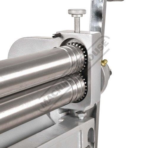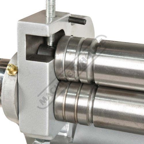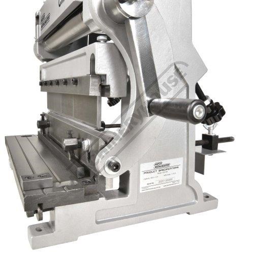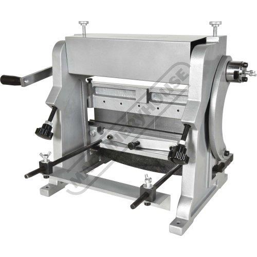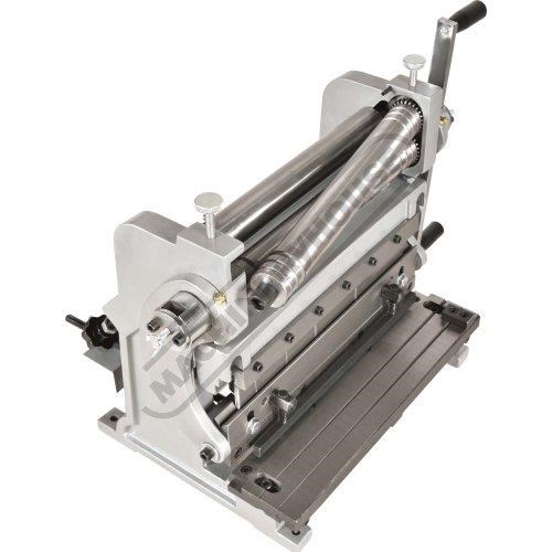A compact three-function sheet metal working machine which will shear, roll and bend thin sheet material up to a maximum width of 300mm. The handle operates all three functions at the same time, but only one function can be used at one time - the rolls incorporates wiring grooves and are rotated directly whilst the bending and shearing functions operate via an eccentric cam. The pressbrake bending dies can be removed in sections to allow for partial bends to be formed and the top roll can be removed completely when forming closed cylinders. The maximum thickness capacity of 1mm for mild steel & 1.5mm for soft grade aluminium, This compact machine is perfect on small jobs and low production runs for the home engineer's workshop.