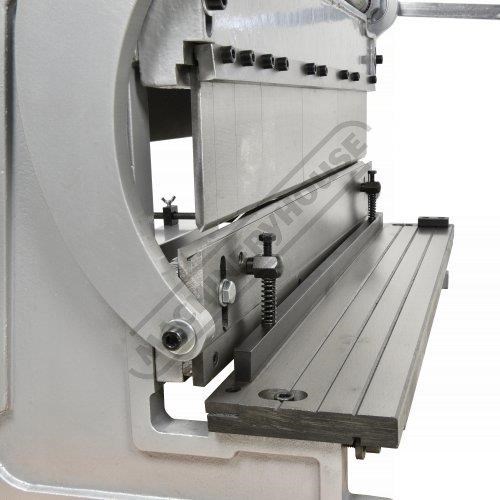A compact three-function sheet metal working machine which will shear, roll and bend thin sheet material up to a maximum width of 760mm. The handle operates all three functions at the same time, but only one function can be used at one time - the rolls incorporates wiring grooves and are rotated directly whilst the bending and shearing functions operate via an eccentric cam. The pressbrake bending dies can be removed in sections to allow for partial bends to be formed and the top roll can be removed completely when forming closed cylinders. The maximum thickness capacity of 1mm for mild steel & 1.5mm for soft grade aluminium. This compact machine is perfect on small jobs and low production runs for the home engineer's workshop.