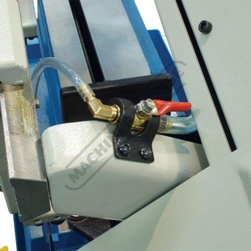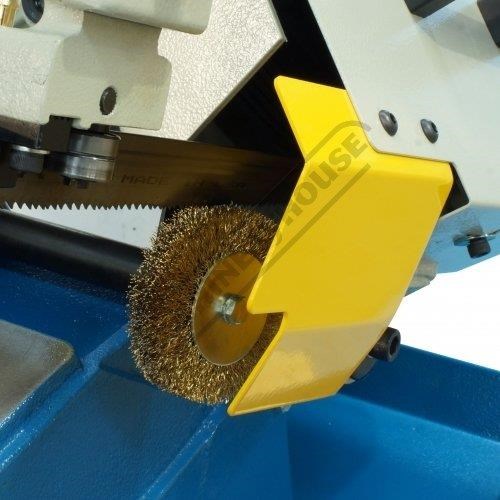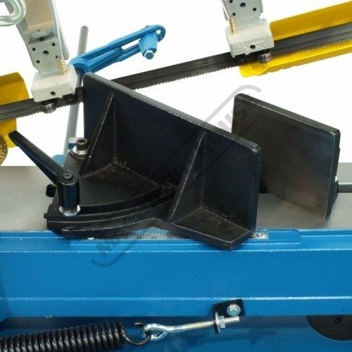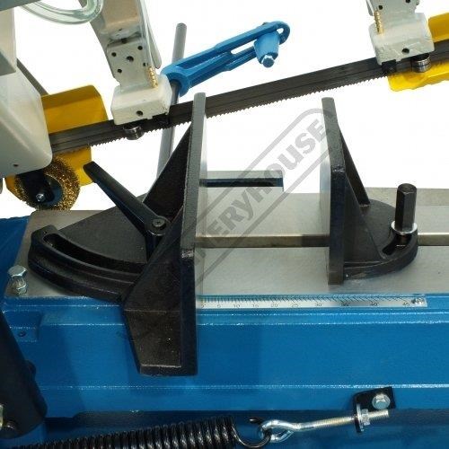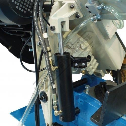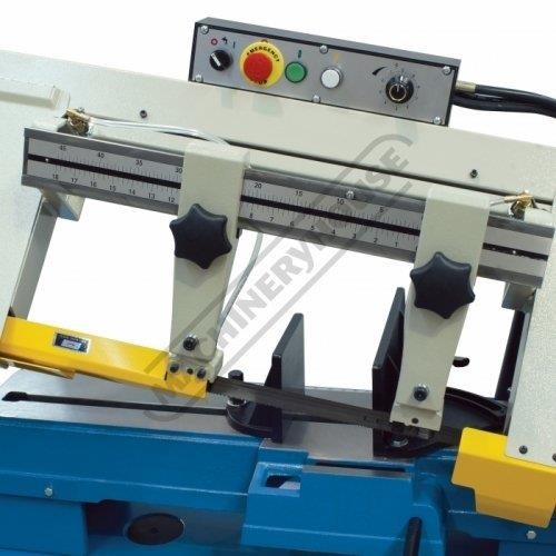 The downward cutting pressure is controlled by a fully adjustable hydraulic damper with an on/off valve and there is an automatic cut-off at the end of the cut. The vice rotates for mitre cutting and there is an adjustable material stop for consistent repeat length cutting.