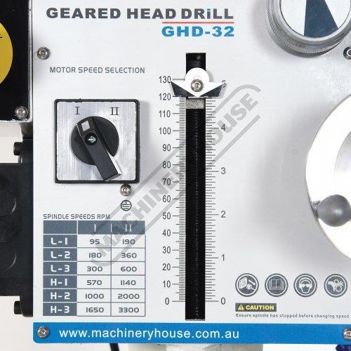 The GHD-32 Industrial 4MT Geared Head Drilling Machine is the next model up from the GHD-22 & GHD-30V. This drill is our entry level machine with a 4 morse taper spindle to handle holes up to 40mm. it also has all the goodies like auto feed, thread tapping function, tilting & rotating large cast table and a rack & pinion height adjustable work table and drill head.