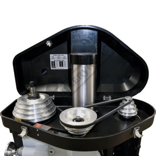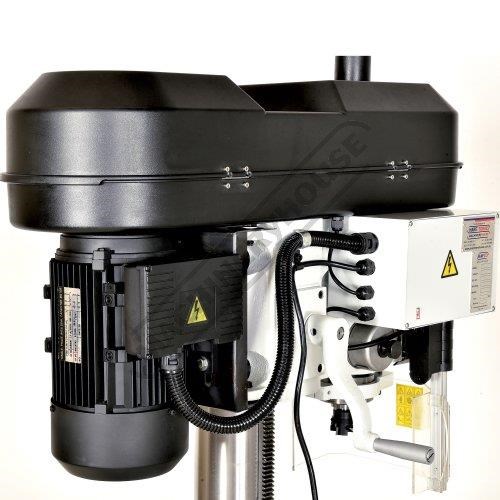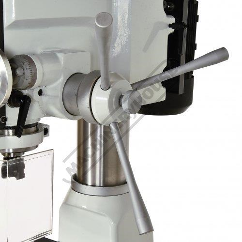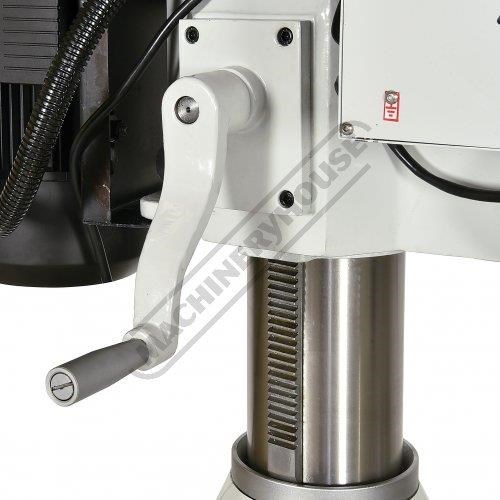 The belt driven head provides a useful range of 12 speeds, 100-2080rpm and is quiet in operation, the head can be re-positioned on the column with the aid of a handle driven rack and pinion drive.