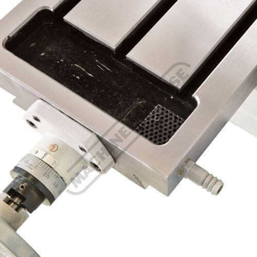 The table has T slots to allow the work to be directly mounting to table, or in a milling vice, with two large diameter control hand wheels with metric calibrations for the longitudinal axis.