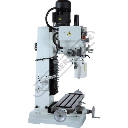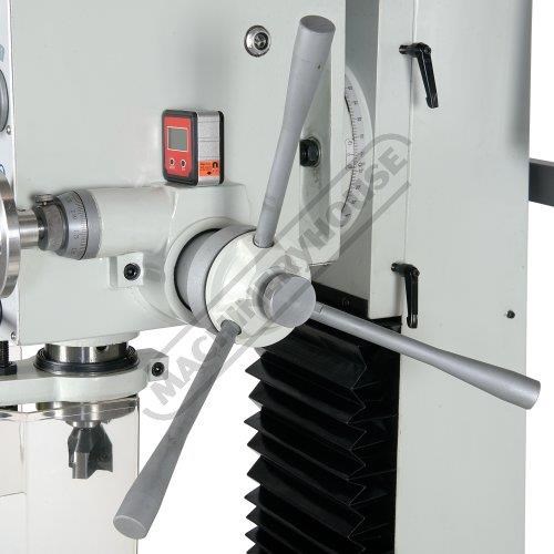 The usual handle-driven down feed is available for precision drilling and there is a fine manual down-feed control for precise vertical milling.