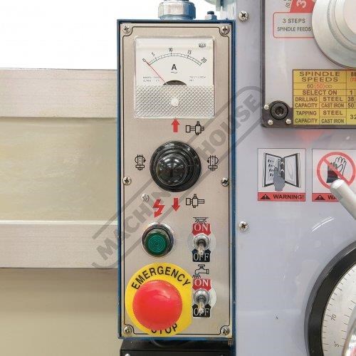 The user-friendly unique 4-way joystick control operates the spindle speed direction and the rise and lowering of the head. The machine is also fitted with an amp load metre providing direct and instant load feedback on your current drilling job. The front control panel has a very helpful drilling chart with suggested speeds to use on the different material types with the corresponding drill bit size, this is a general guide from where to begin as each job must be adjusted individually.