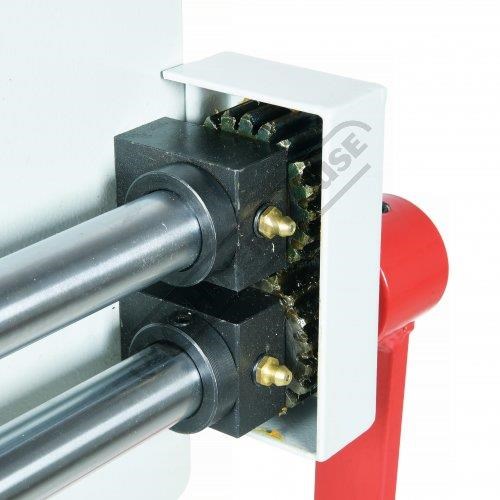 This bead roller is manually gear driven by a hand crank that drives both the bottom and top bead rolls simultaneously. The 25mm drive-shafts are supported in quality bronze bearing bushes that incorporates greasing nipples to ensure smooth rolling operation.