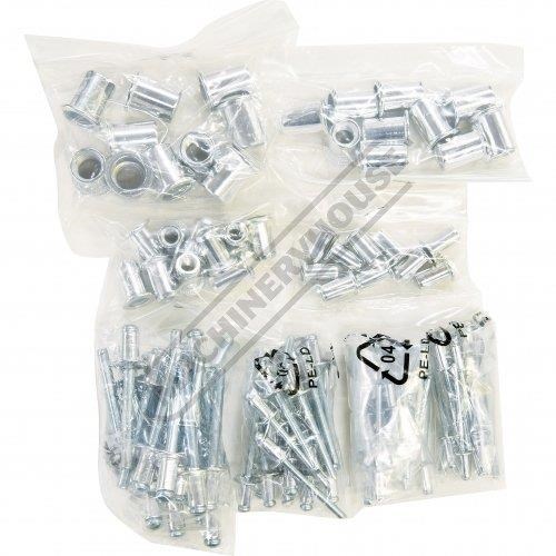 The 130 piece nut & blind riveter kit includes a heavy duty hand operated twin handle nut riveter manufactured from aluminium & steel with moulded handles for better grip. The set also includes 40 aluminium rivet nut inserts - (10 of each size) & 4 mandrels to suit, 80 aluminium blind rivets - (20 of each size) & 4 blind rivet mandrels to suit and all is neatly stored in a blow moulded carry case.
