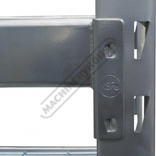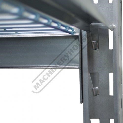 Each bay consists of four levels with wire mesh inserts, each shelf has a capacity of 364kg. The vertical posts have provision to adapt an optional racking extensions (S014A) to double the storage. The shelf rails are secured in position and locked in via a wedge system. Simply very easy to assemble without the use of any tools.