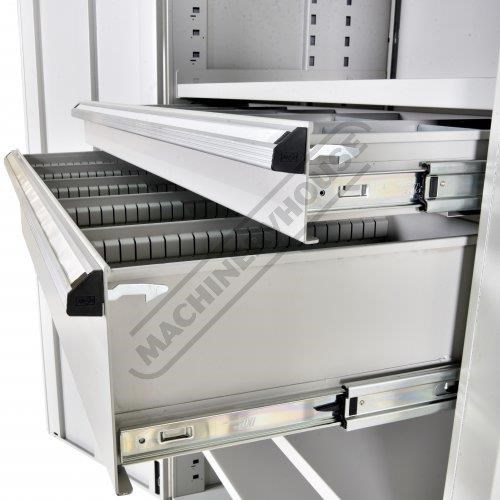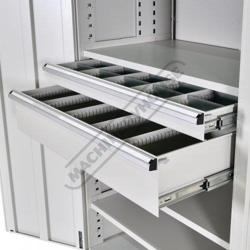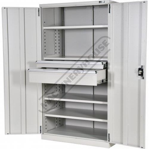 This cupboard comes standard with 4 shelves, 1 x 100mm deep drawer & 1 x 200mm with all being adjustable allowing you the ability to set up the positions of the shelves or the drawers to suit your application, optional extra drawers & shelve packs are available for further customisation.