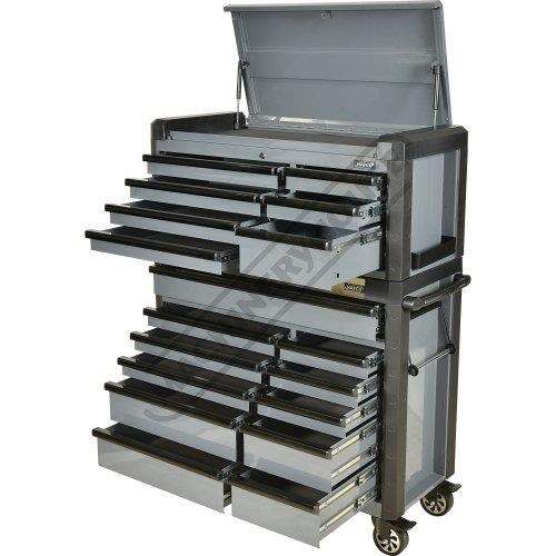 Choose from sizes ranging from 28 to 44 inches, available in stackable roller cabinets and tool chest combinations or sold separately. The Deluxe Series is packed with features such the corner armor for maximum durability, while roller cabinets flaunt a stainless-steel tray top - perfect for small teardowns and dirty parts. The moulded tools and parts holders will keep everything where you left them, while handy side storage bins add extra dimensions to your storage solutions. The soft-close drawers with ball-bearing slides and foam mat liners keep your tools clean and safe. Tool chests feature twin gas-struts, and the complete range is key lockable.