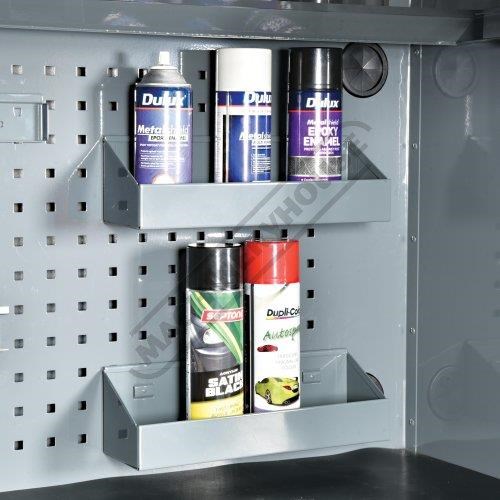 Includes 1 x shelf 1 x screwdriver holder 2 x rattle can holders and 2 x bucket holder brackets