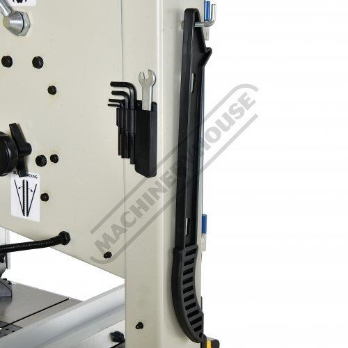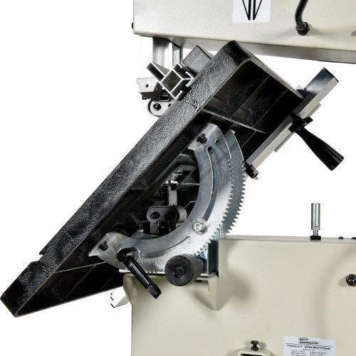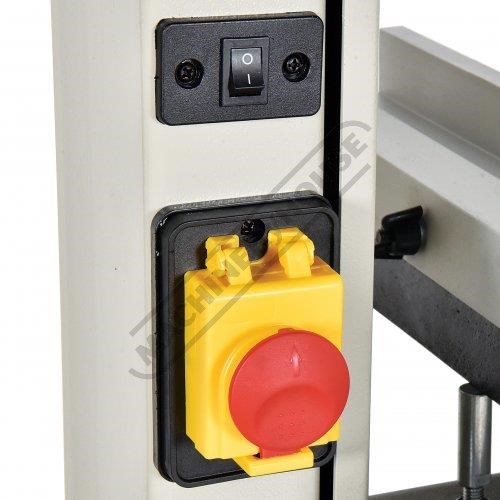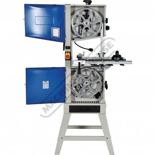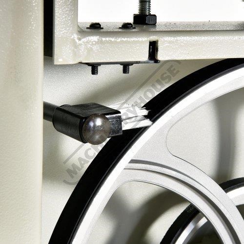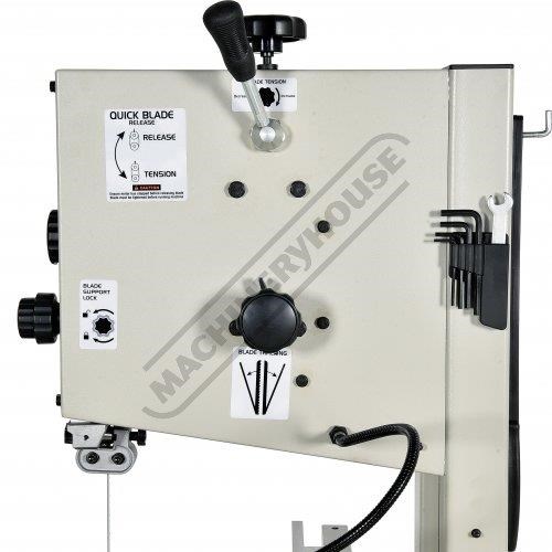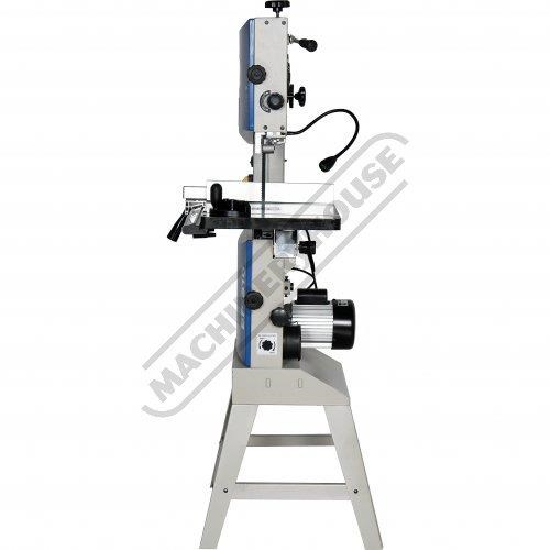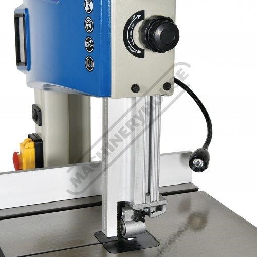 This bandsaw has a welded steel frame designed to keep your machine from twisting whilst cutting at 305 x 165mm capacity. It has a generously 480 x 390mm cast iron table with an aluminium rip fence and mitre guide to help you cut straight or angles to the required size. The table mounting trunnions are adjustable to get your tale to tilt from 90 to 45 degrees and has a quick action locking lever. This machine also has its own LED light that is mounted to a flexible arm so the light can be adjusted direct on the cutting line no matter what timber size you are cutting.