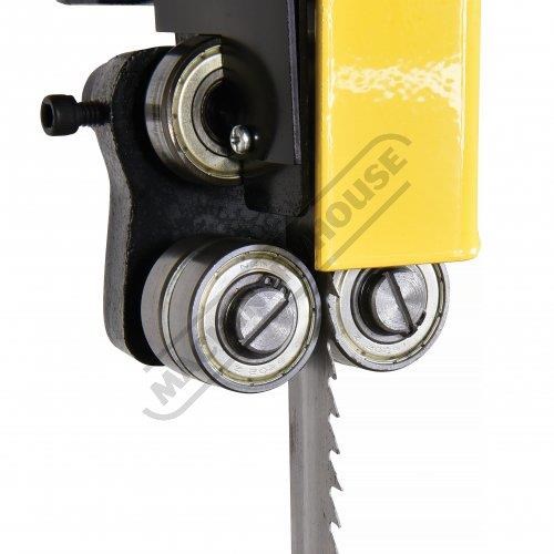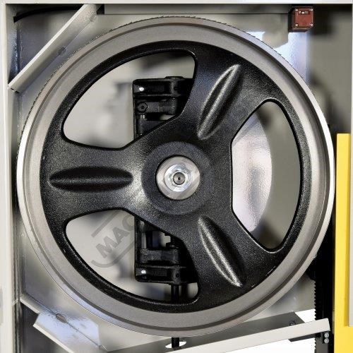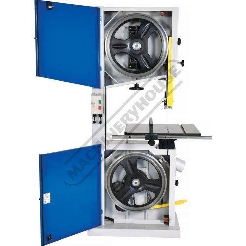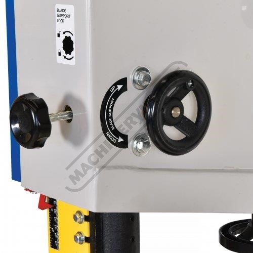 The 6 ball bearing blade guide system, 3 located on the adjustable height guide & 3 below the table offer outstanding blade accuracy that is required in a heavy duty machine. Also fitted are cast iron trunnions that offer a solid table mounting base and allows the table to tilt and be securely locked into place for those jobs that require angle cuts. The worm gear system for the blade guide post movement is used for quick and easy height adjustment settings. Safety features like magnetic power switch & tamper proof door interlock micro switches are fitted to this machine providing peace of mind for the operator.