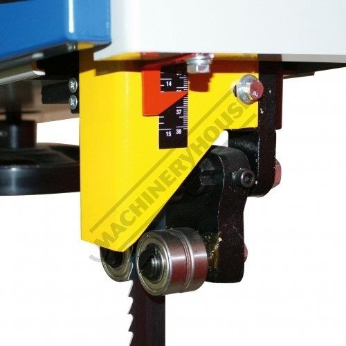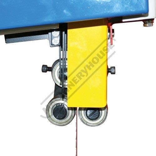 The 10 ball bearing blade guide system, 5 located on the adjustable height guide & 3 below the table offer outstanding blade accuracy that is required in a heavy duty machine. Also fitted are cast iron trunnions that offer a solid table mounting base and allows the table to tilt and be securely locked into place for those jobs that require angle cuts. The worm gear system for the blade guide post movement is used for quick and easy height adjustment settings. Safety features like magnetic power switch & tamper proof door interlock micro switches are fitted to this machine providing peace of mind for the operator.