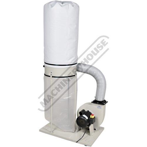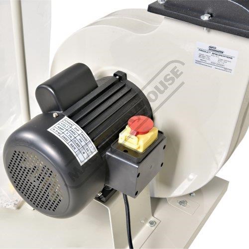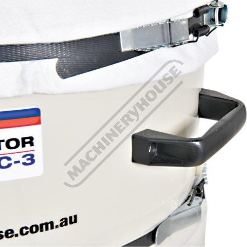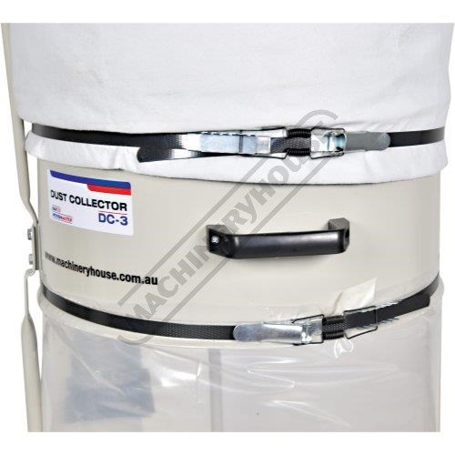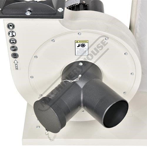 The DC-3 is a low-pressure high-volume dust collector (LPHV), dust and shavings of LPHV extractors are sucked through the impeller fan blade, the heavier waste falls into the lower bag with the air being exhausted through the top filter bag which aids in collecting some of the fine dust on the way out. This type of extraction shifts huge volumes of air at low pressure. They are very efficient at removing bulk waste, recommended for Planers, Thicknessers & Wood Lathes etc, hence some people call them chip collectors. The fine filtration efficiency can be improved somewhat by fitting a cyclone and replacing the bag with a cartridge filter.