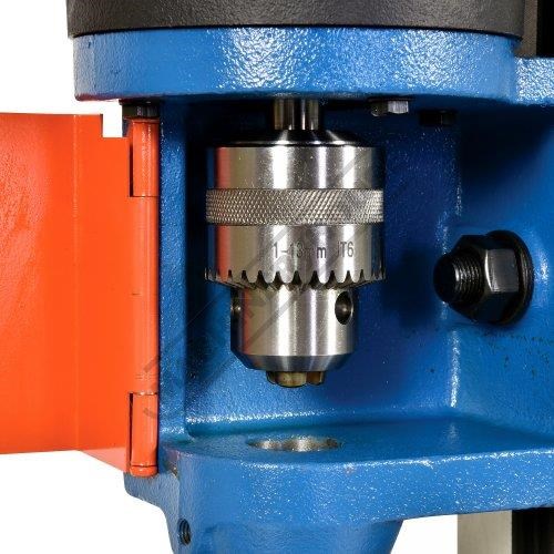 A gas strut in the rear column enables smooth headstock travel and allows ``parking`` at any position. The large cast iron table includes a tall rear fence and an easily adjustable depth stop for consistent accuracy. Designed for busy workshops, this reliable machine delivers years of precise, trouble-free performance.