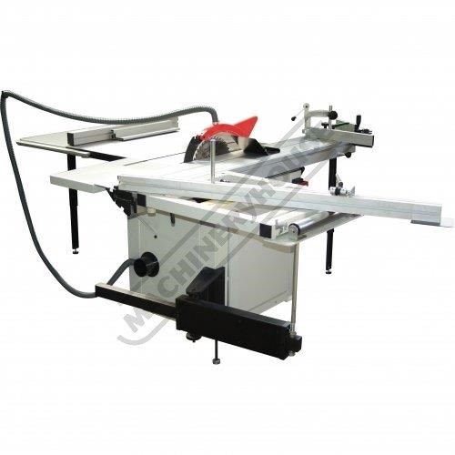 The main table is heavily webbed cast iron which provides a rigid mounting point for the 315mm main blade and a 90mm scoring (scribe) blade. The table also has sheet metal side and rear extensions to increase working area to 1260 x 800mm. Ample power is provided by the 3kW / 4hp 240V induction motor to drive the blades through the most stubbornness timbers. The whole motor frame is a substantial cast iron unit with the blade height and tilt mechanisms being particularly very smooth in action when adjusted to desired height or angle. This great machine is supplied with a rip fence, mitre fence with work clamp and both main & scribe blades.