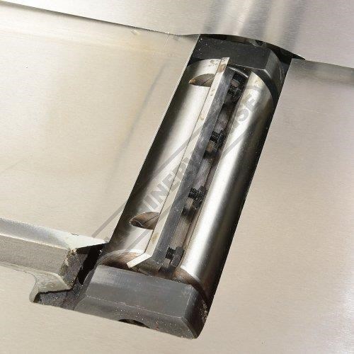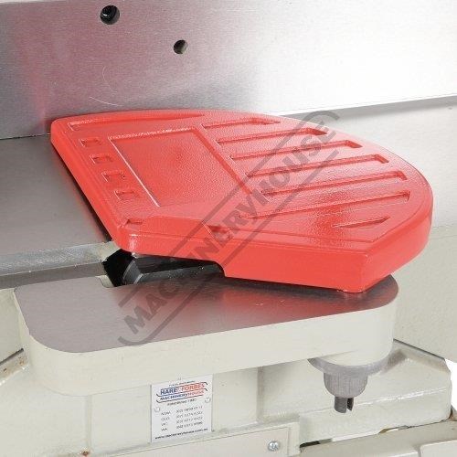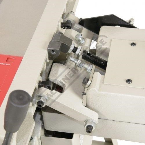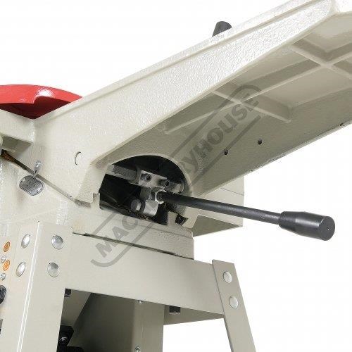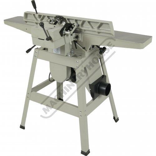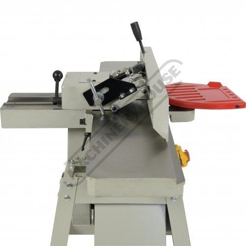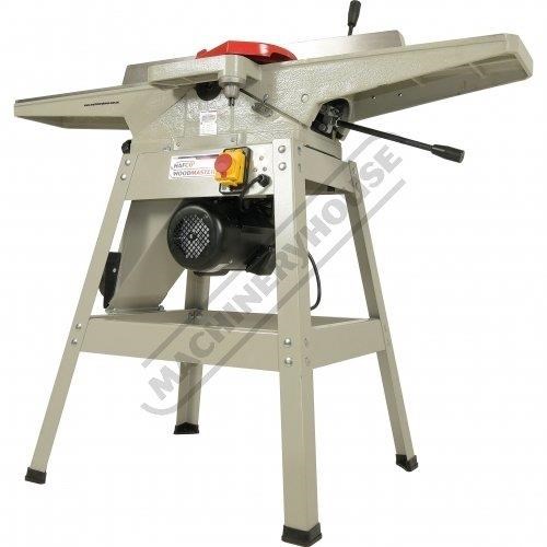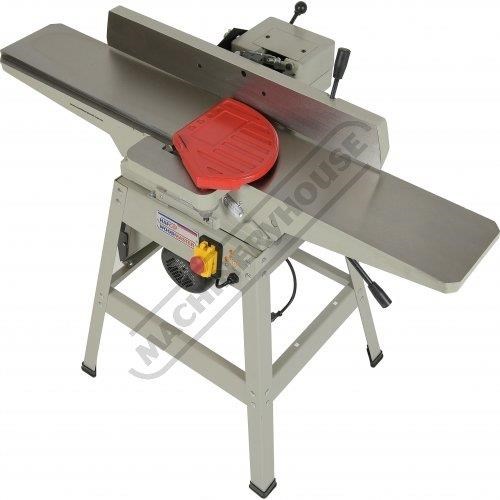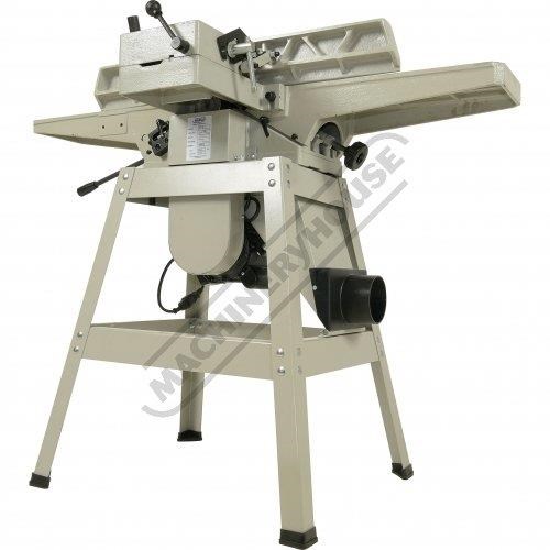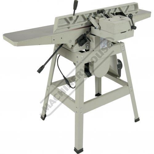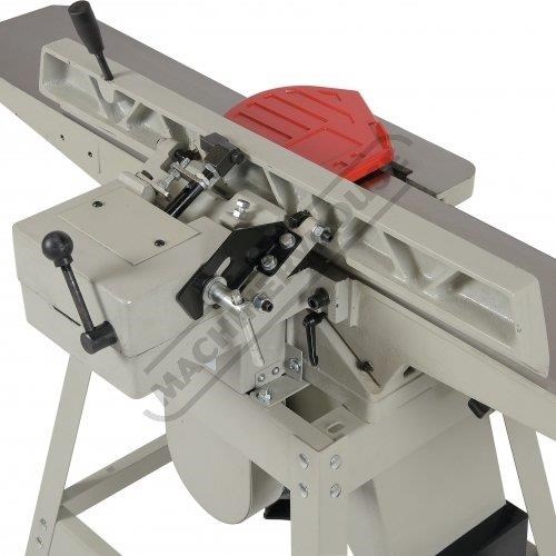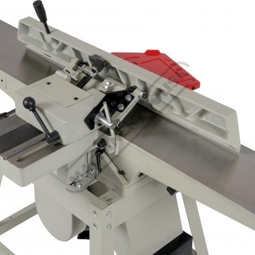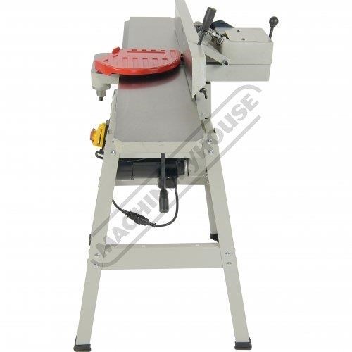 This surface planer is constructed largely of cast iron and is mounted on a fabricated sheet metal frame stand which also houses the motor and the switchgear. The planer cutter blades are fully protected across its whole width by a strong aluminium guard with spring load return for additional safety. The infeed and outfeed tables are 1170mm in total length and are both independently adjustable for height, which not only makes for quick adjustment of the blade height relative to the table but allows for quick set up to produce rebates up to 8mm deep. There is also a quick stop system on the infeed table to allow repeat depth settings to be made quickly.
