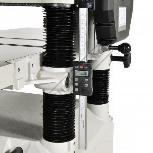 Constructed from robust cast iron, its solid base, feed tables, and cutter head ensure stability and excellent vibration absorption. Exceptional power is provided by a 3.75kW / 5hp 415V induction motor, housed in the base, which drives the cutter block via a twin-pulley V-belt system. Solid cast iron extension tables are fitted at both the front and rear, enhancing timber support, while a digital height gauge ensures precise and accurate adjustments.