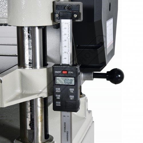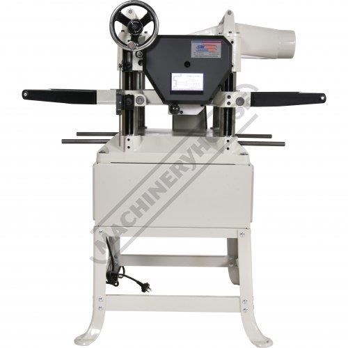 The cutter head is supported by 4 x solid pillars at each corner and the steel drive rollers have ribbing to ensure positive grip on the timber through the machine via two speed gearbox at a rate of 16 or 20fpm. The feed roller pressure can be adjusted with the four adjusters on the top of the machine. The depth of cut is set by means of the cranked handle on the side using the setting scale positioned on the in-feed side or digital readout.