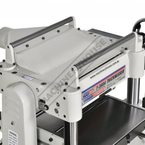 The Hafco T-380 thicknesser manufactured in Taiwan with three knife cutter head is a heavy duty machine with very substantial cast iron body and heavy gauge sheet steel base. The cast iron thicknessing table which has a polished surface to help timber slide freely as well as to help reduced vibration to improved quality of cut.
