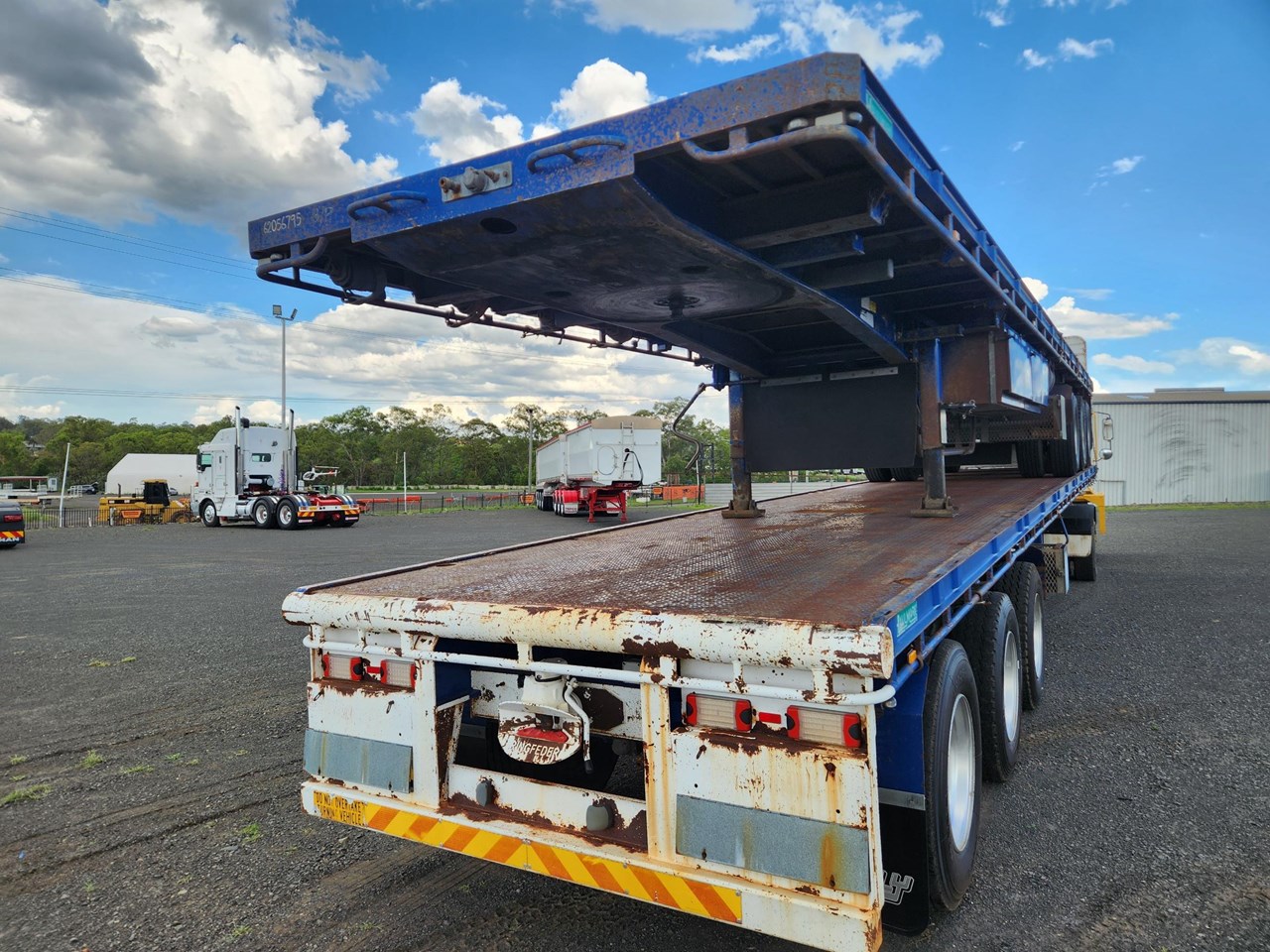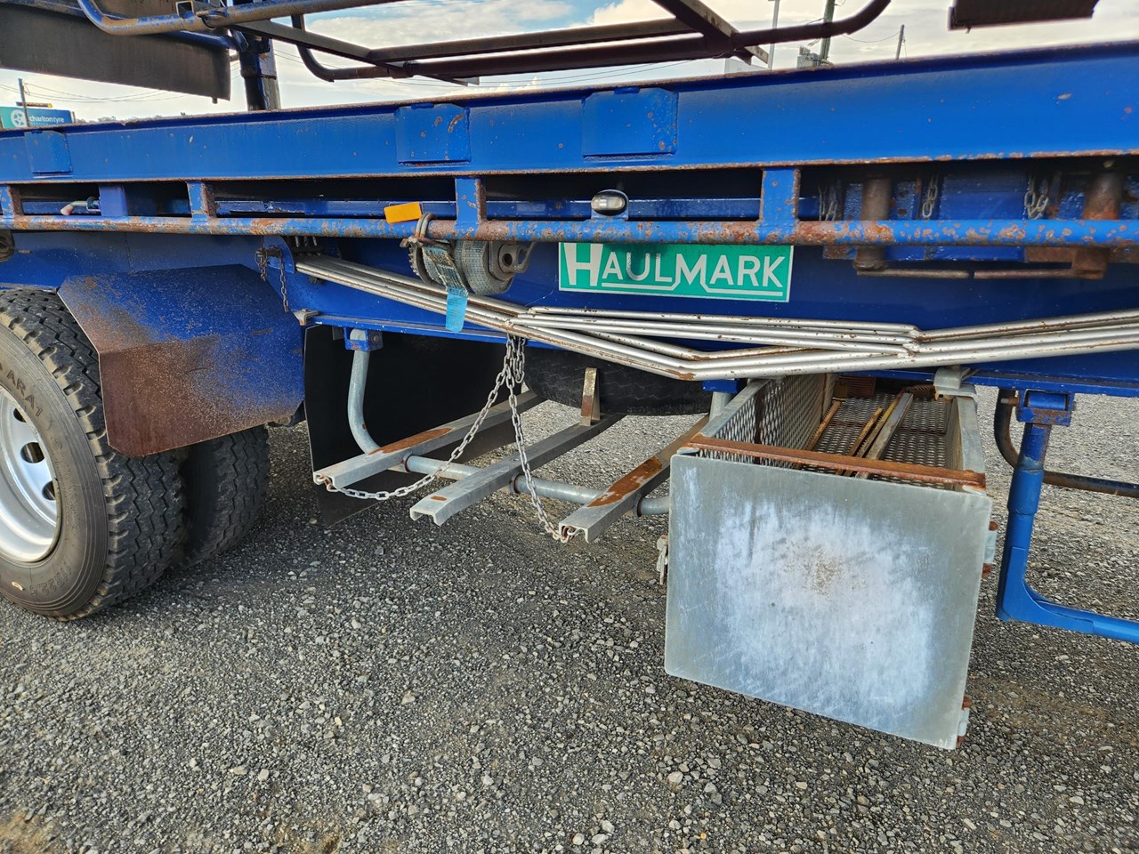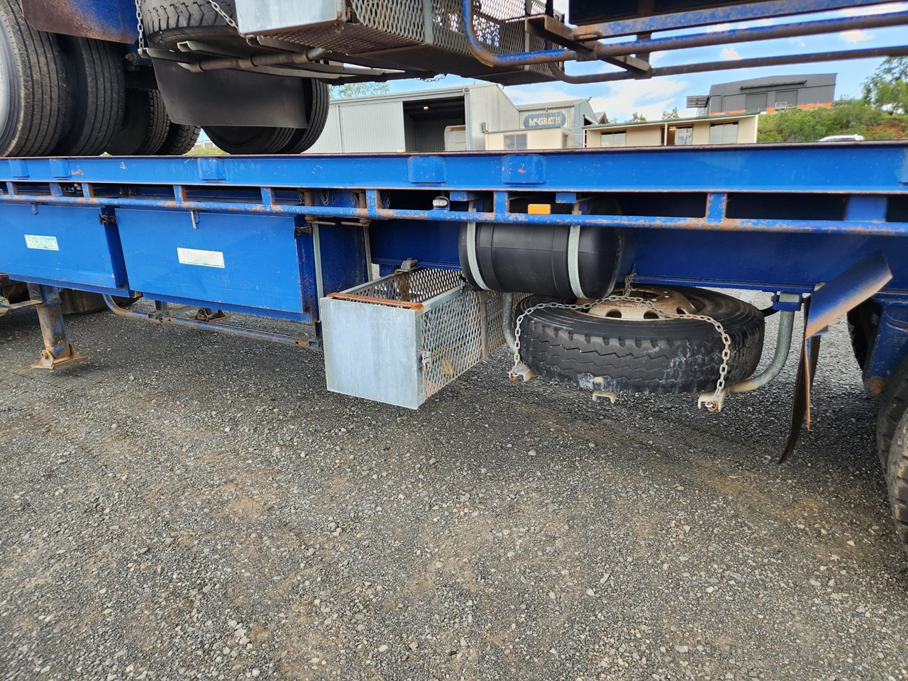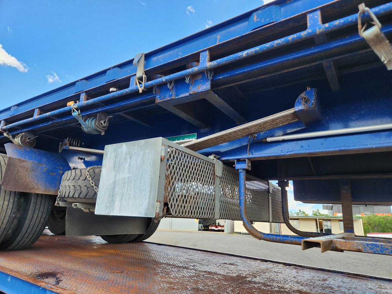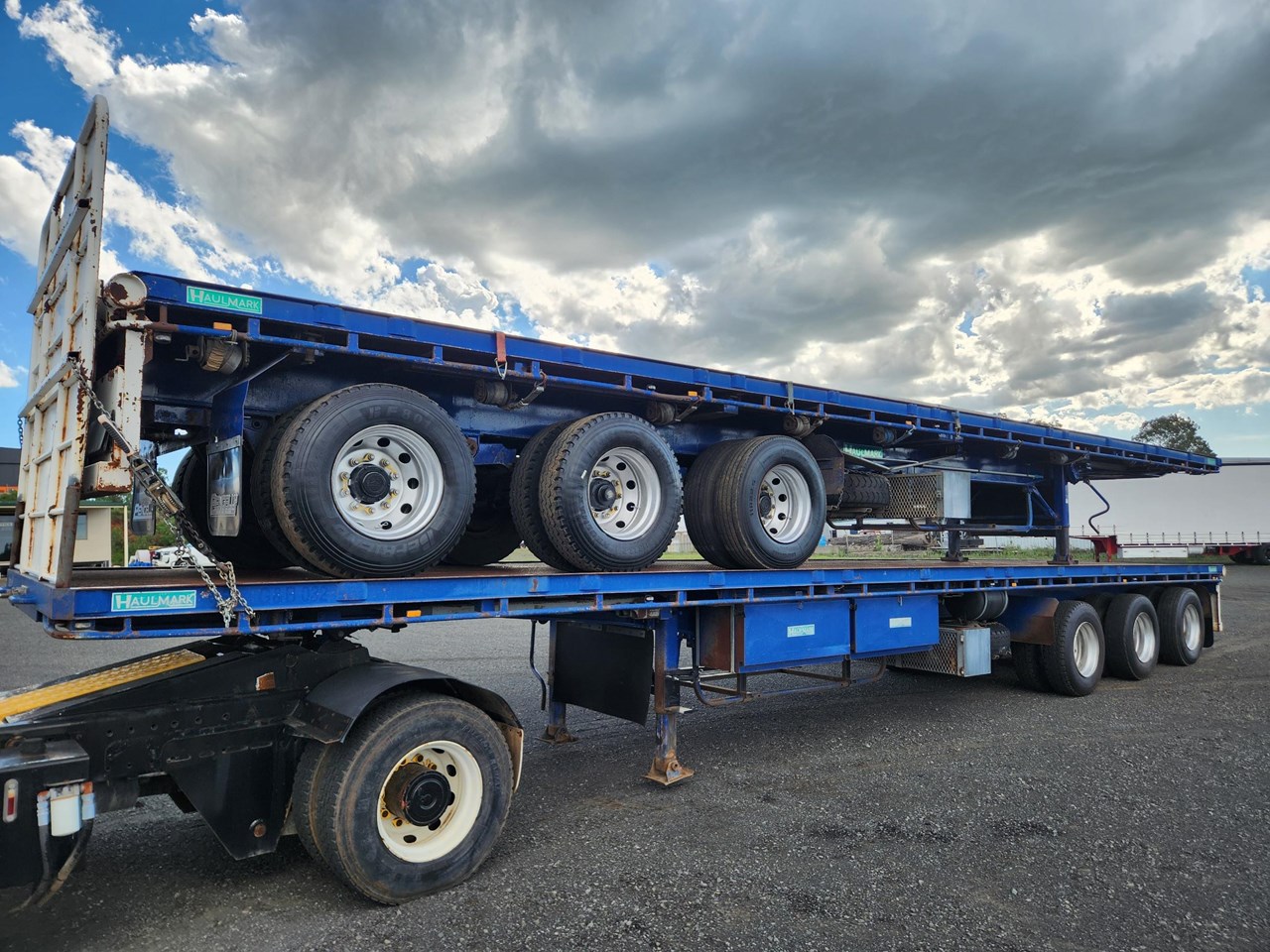 2014 HAULMARK FLAT TOP SEMI TRAILERS. SELLING AS A PAIR. 5 INCH COMBING RAILS. 3 WAY CONTAINER PINS. PIPE BOLSTERS. SPRING SUSPENSION WITH 10'1 SPREAD. K HITCH AXLES WITH UNITISED HUBS. 10 STUD STEEL WHEELS. FRONT AND REAR END RACKS. WINCH STRAPS IN TRACK. 2 X TOOLBOXES. WATER TANK. TIMBER BOX. 13.6 METRE DECK. BOTH ROAD TRAIN LEAD TRAILERS. SELLING IN AS IS WHERE IS CONDITION.