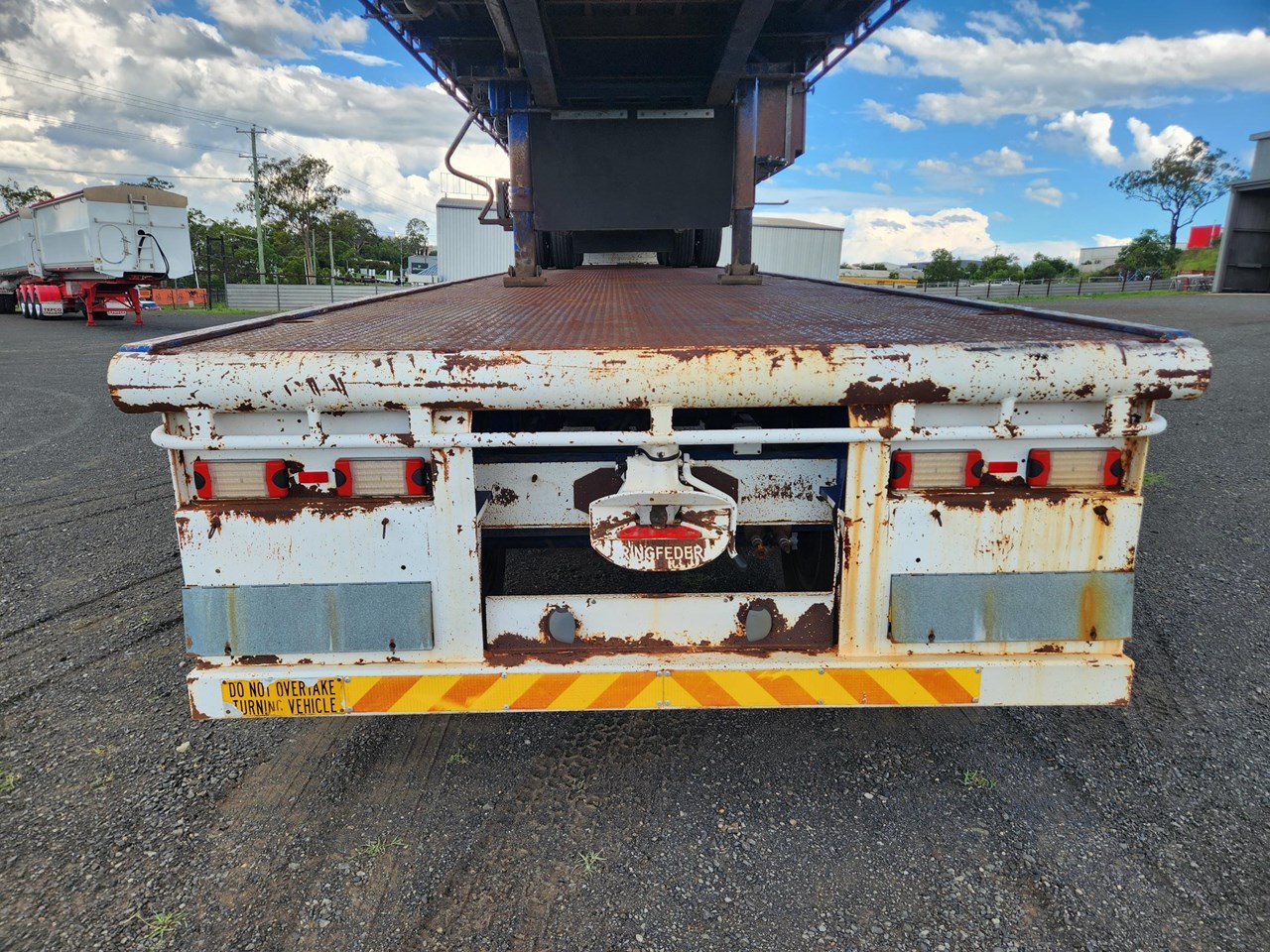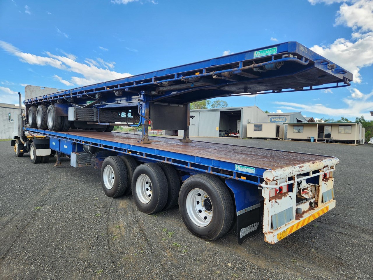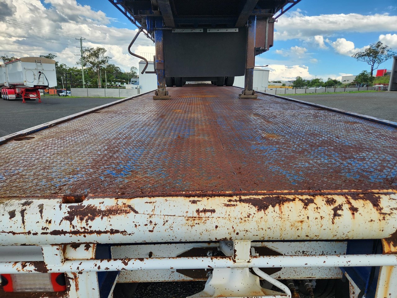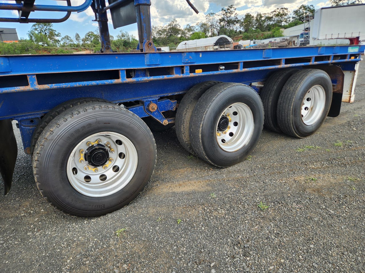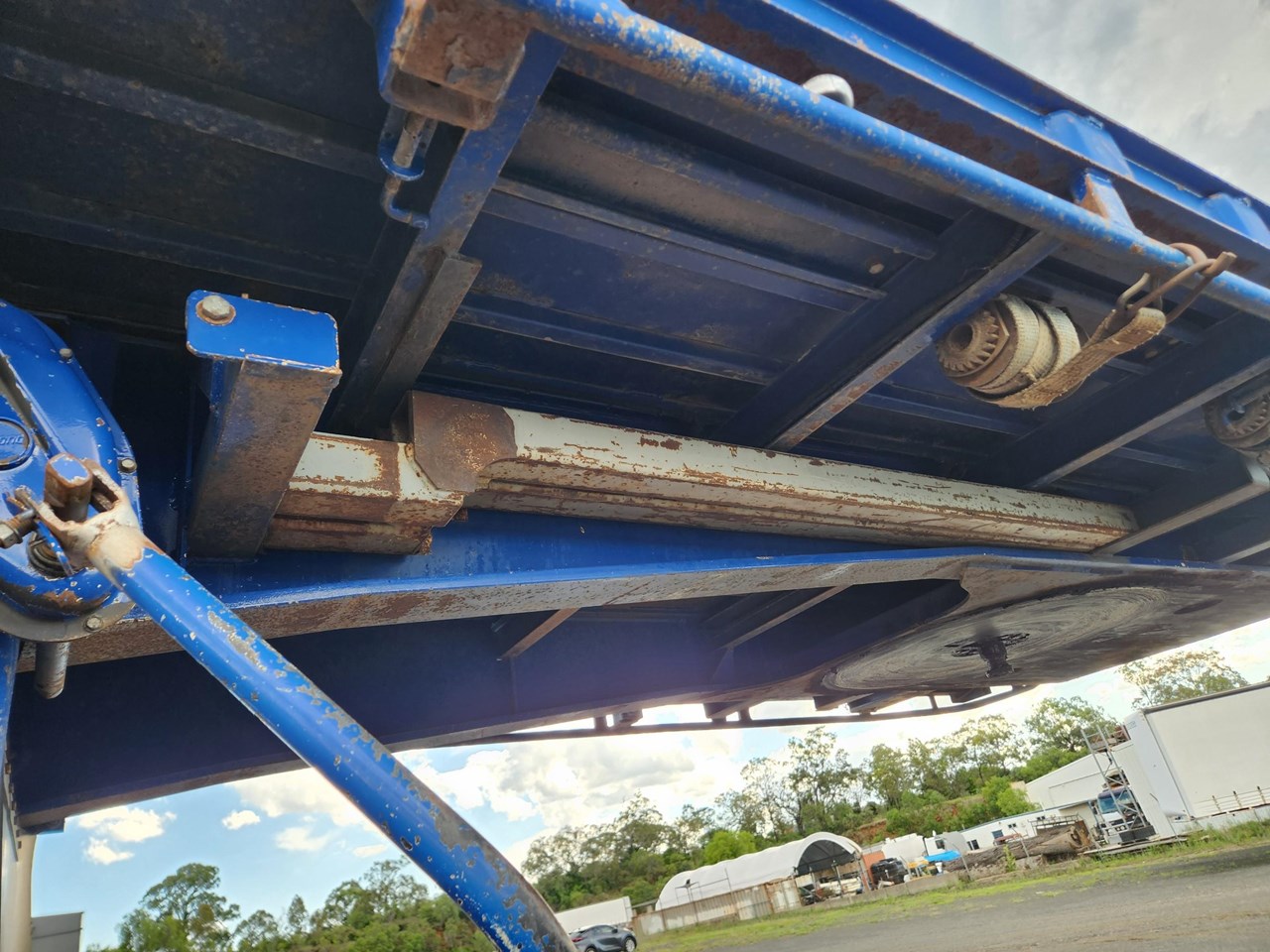 2014 HAULMARK FLAT TOP SEMI TRAILERS. SELLING AS A PAIR. 5 INCH COMBING RAILS. 3 WAY CONTAINER PINS. PIPE BOLSTERS. SPRING SUSPENSION WITH 10'1 SPREAD. K HITCH AXLES WITH UNITISED HUBS. 10 STUD STEEL WHEELS. FRONT AND REAR END RACKS. WINCH STRAPS IN TRACK. 2 X TOOLBOXES. WATER TANK. TIMBER BOX. 13.6 METRE DECK. BOTH ROAD TRAIN LEAD TRAILERS. SELLING IN AS IS WHERE IS CONDITION.
