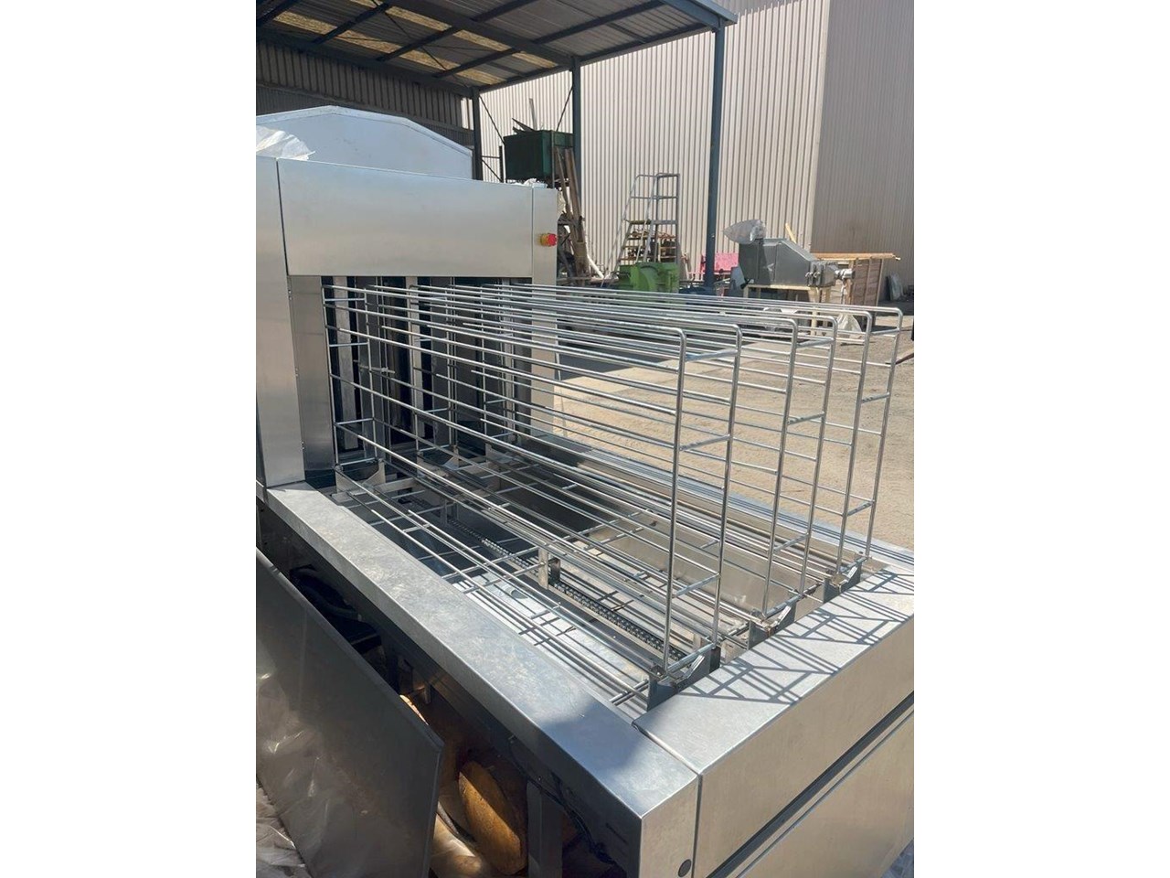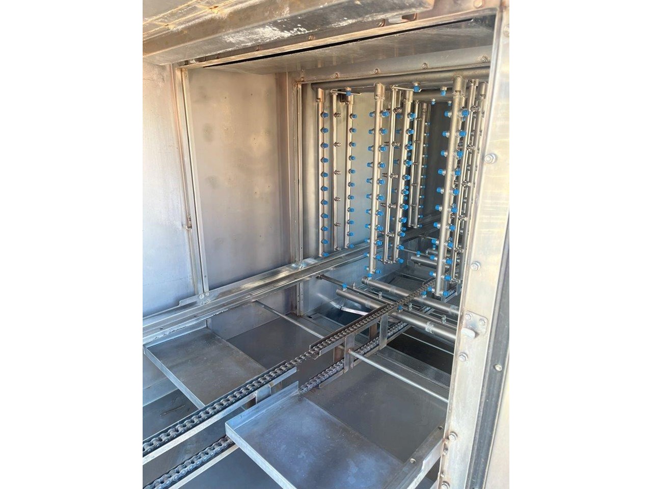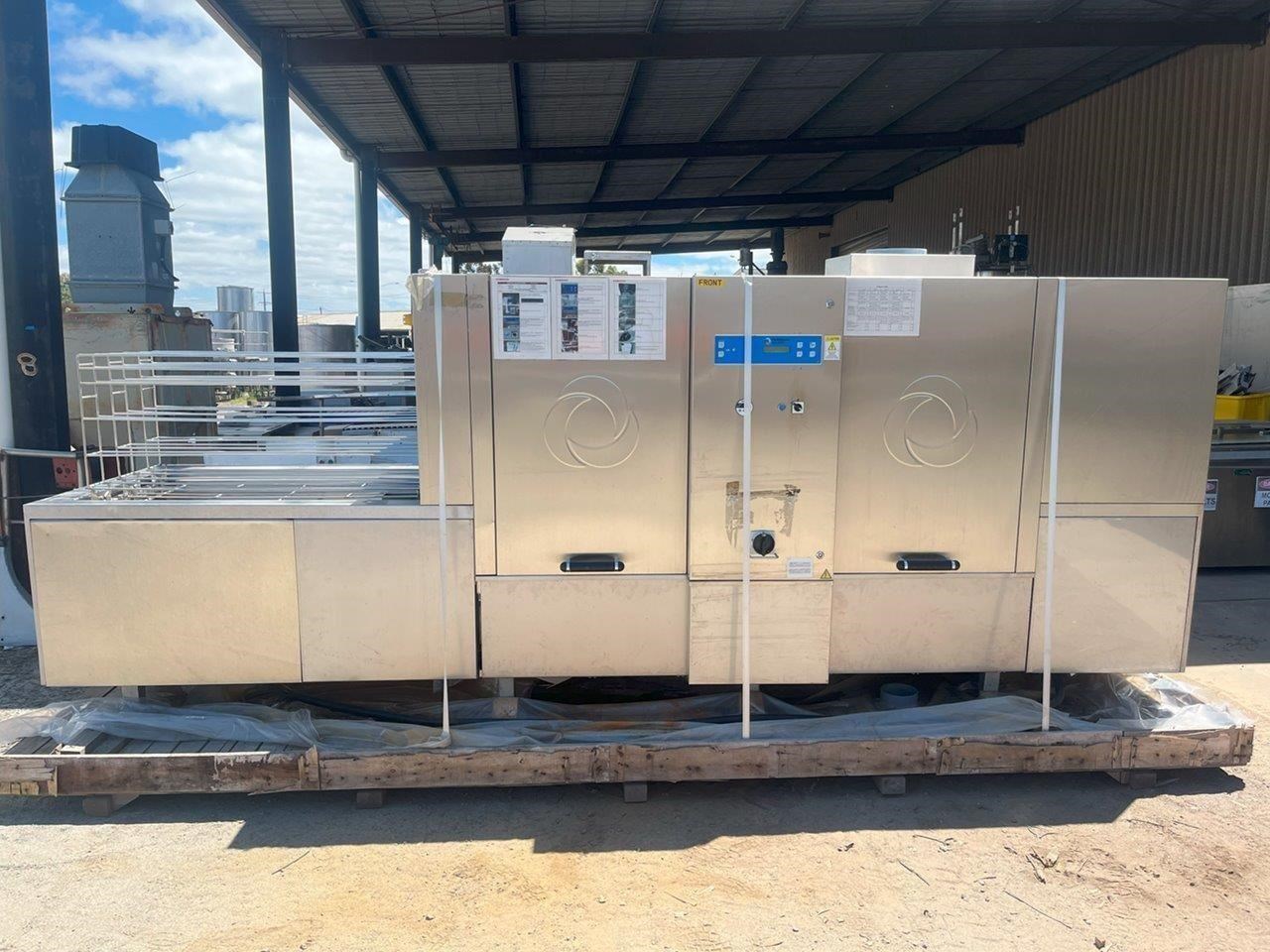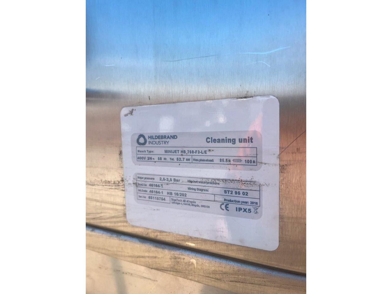 Hildebrand Industry - Cleaning Unit. This system is suitable for washing, rinsing and drying a wide variety of cleaning goods. Whether containers, molds or parts of chocolate processing plants; the Minijet does a great job, runs efficiently, economically and is characterised by its extremely user-friendly one-person handling. Model: MINIJET HB 750-F3-L/E Production Year: 2016 Power: 400V, 3N Phase, 50Hz Water Pressure: 2.5-3.5 BAR Washing rinsing and drying of Moulds up to 1260 x 110 x 550mm (L x H X W) Total machine length is 4.5mt long Tank 180lt Rinse water per batch 13lt Electric power motors 10kw Electric Power Heating 45kw Exhaust Air 3500 m3/hr Motor driven wash and carrier for forward and reverse movement. Maintenance and cleaning doors on the front side of machine IP55 splash proof ss cabinet. 5 cleaning prorgams Electrically heated tank HILDEBRAND UNIVERSAL CLEANING AND DRYING SYSTEM TYPE MINIJET 750-F3-L/E This machine is equipped with a 1 to 3 lane cleaning trolley, a washing and rinsing zone and a high capacity drying zone. It is specially designed for the cleaning of molds ,containers (bins, etc.), animal cages, small parts, etc., and it is designed according to the customized washing goods. OPERATION The transport trolley is manually filled with the items to be washed. After the start of the washing program, the wash cart moves independently to the washing zone. By moving the trolley forward and backward, the efficient washing and rinsing of the items to be washed takes place. Afterwards, the trolley moves through the high-performance drying zone, where the washed goods are dried at high capacity, back to the unloading station. Unit in good condition Ex chocolate factory washing chocolate moulds.