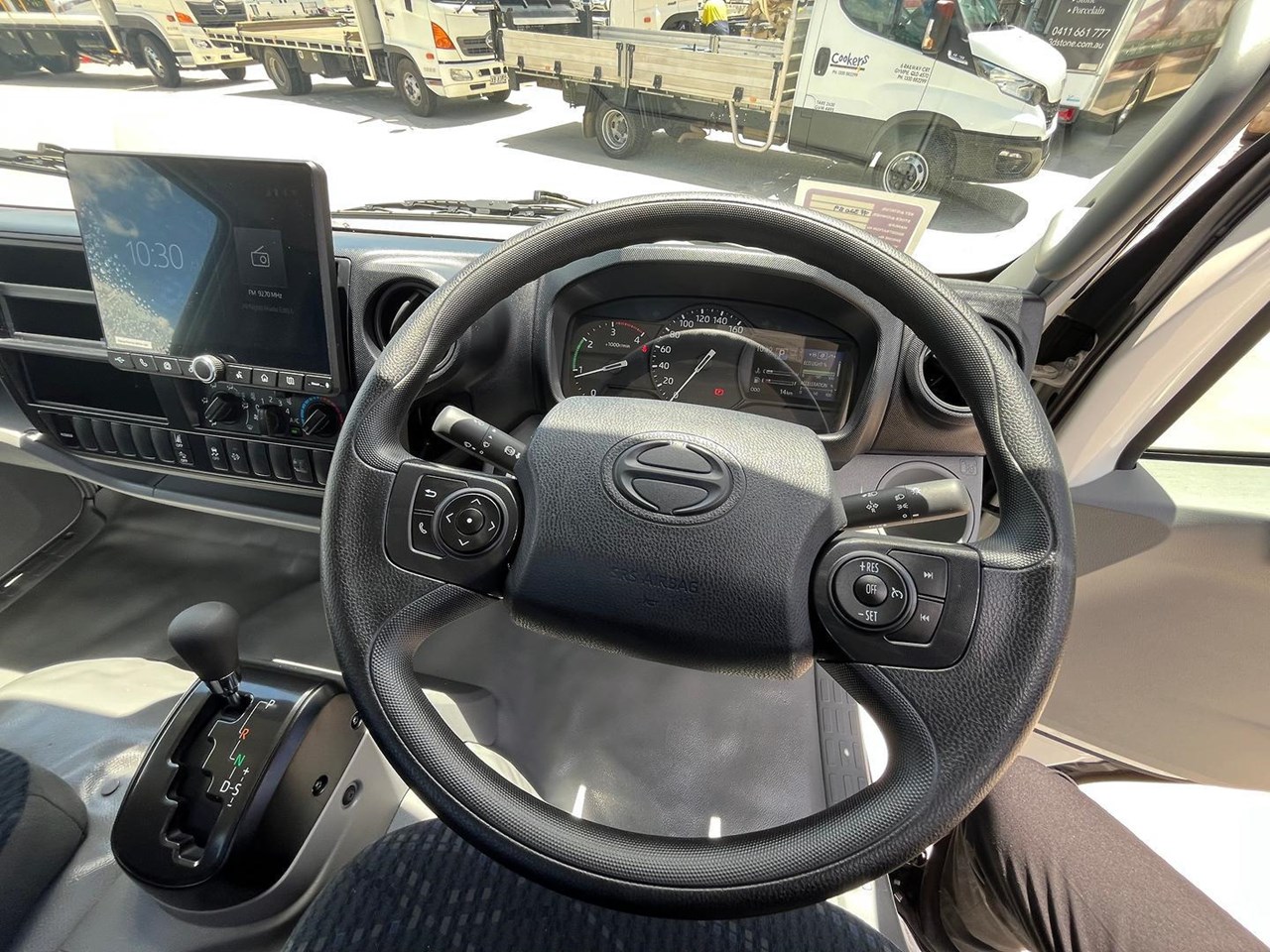 This Hino 616 sits on a 3430mm wheelbase and has a 150hp turbo diesel 4-cylinder engine combined with a proper automatic 6 speed transmission.