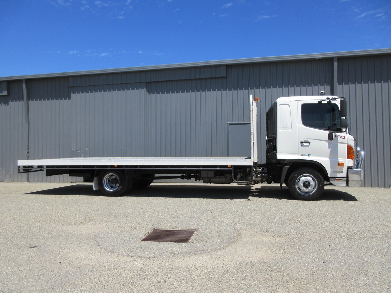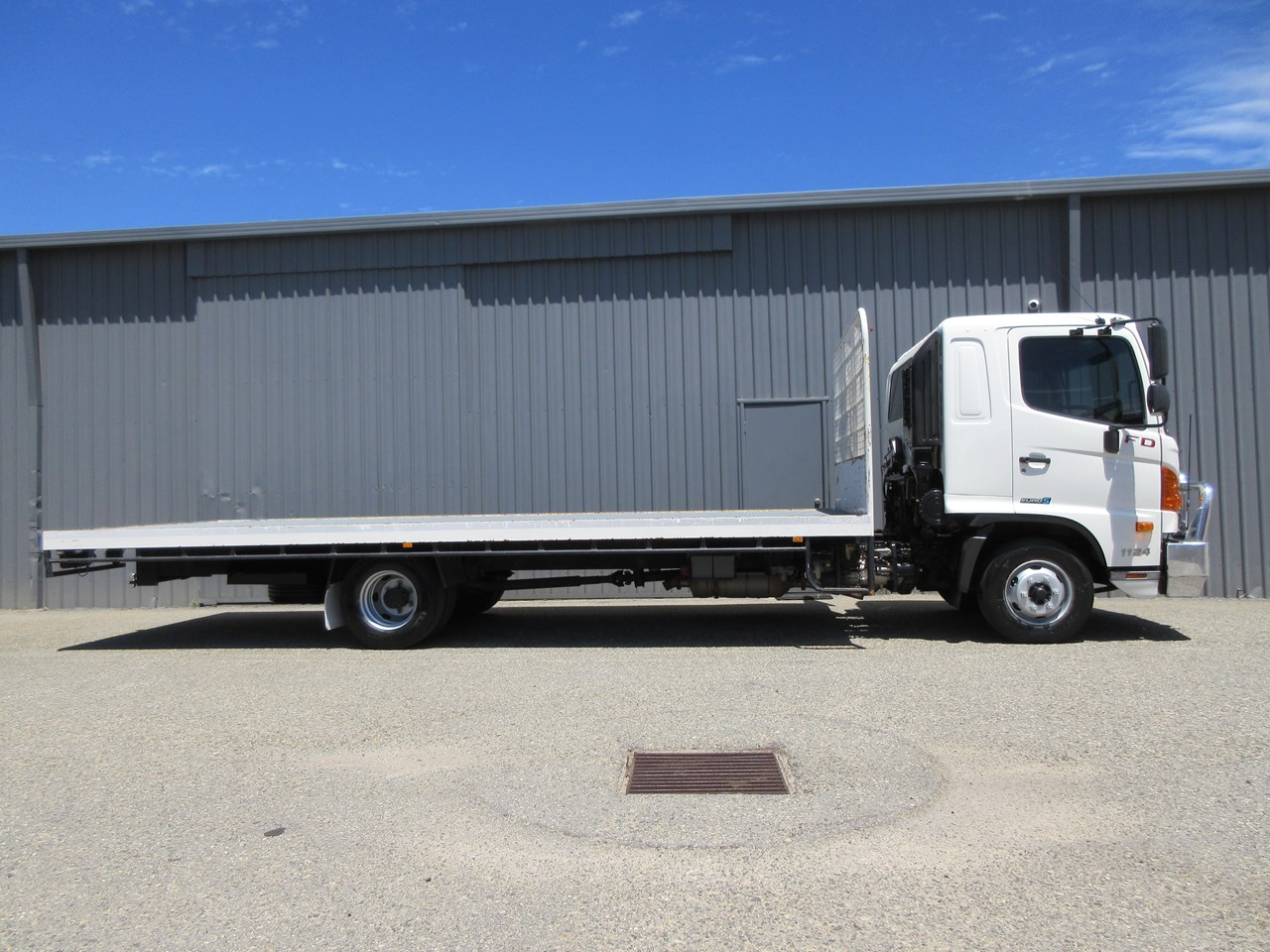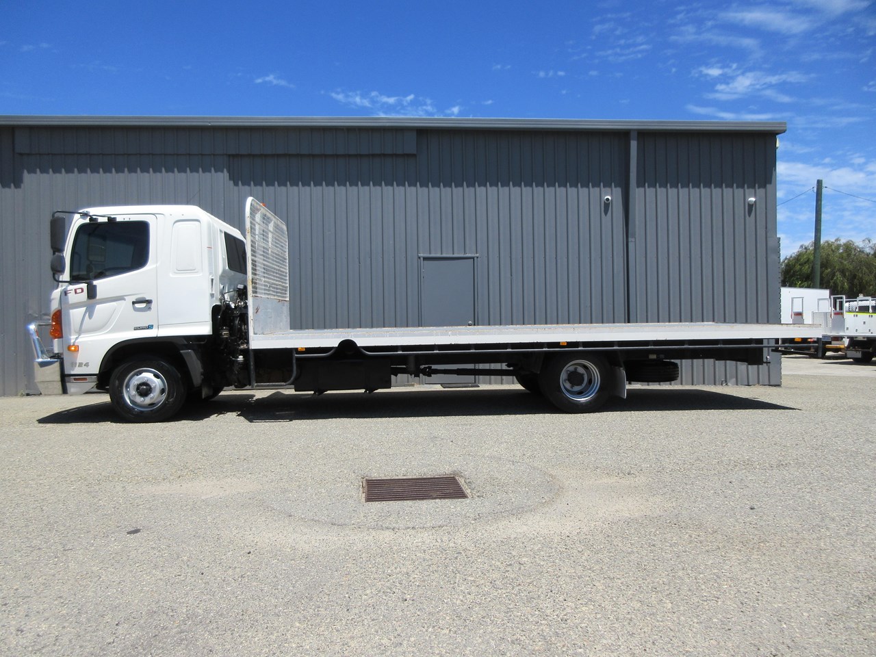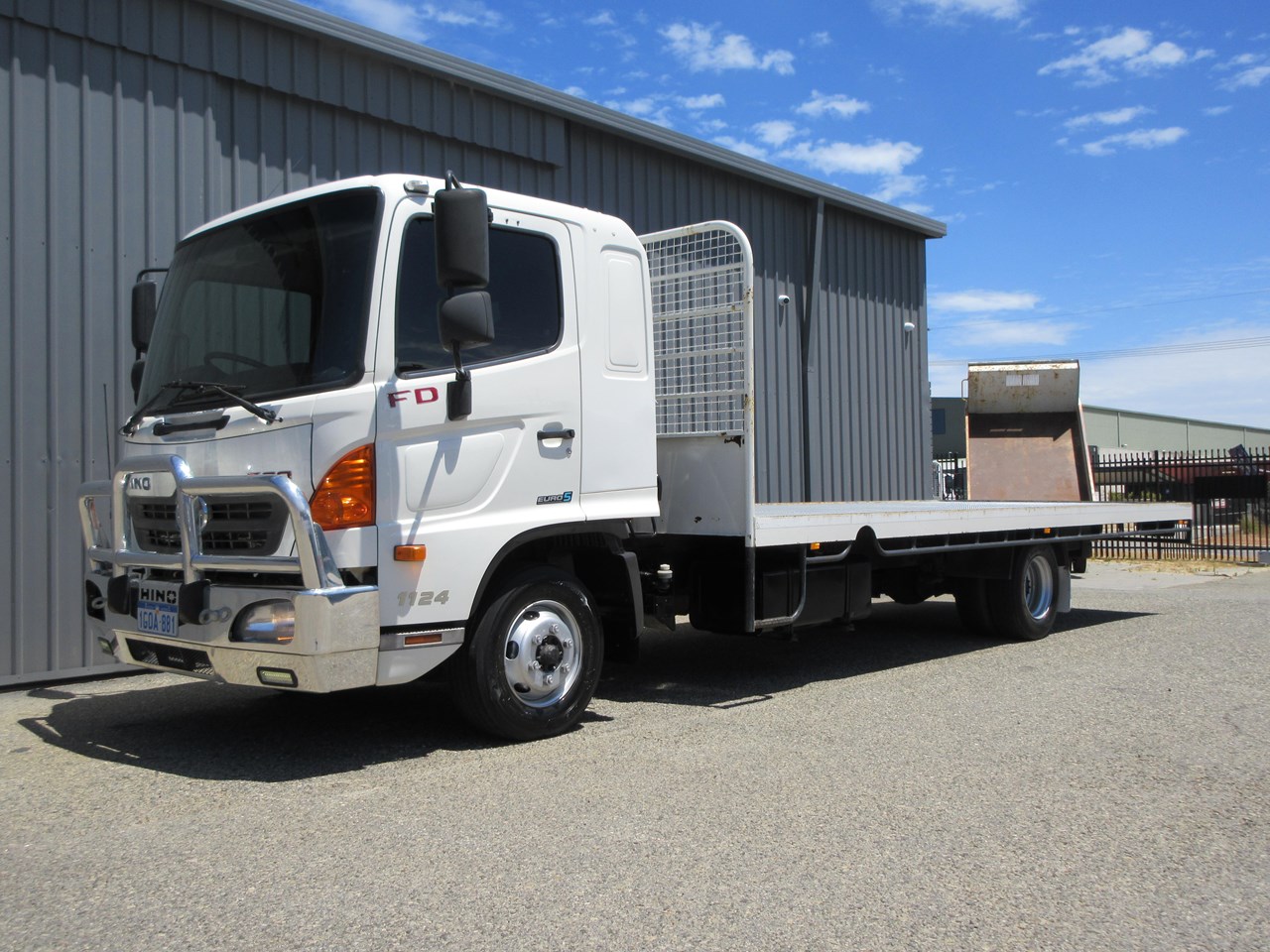 2018 Hino 500 Series FD 1124 fitted with a neat 6400mm x 2500mm Steel tray, heavy duty steps each side of tray & mesh lining to protect the cab, LED Amber Beacon & 50mm Tow Bar & a Lockable battery isolator. 40 Channel 2x way radio, Genuine Hino Polished Alloy Bull Bar, 11,000 Kg GVM & 16,000 GCM.