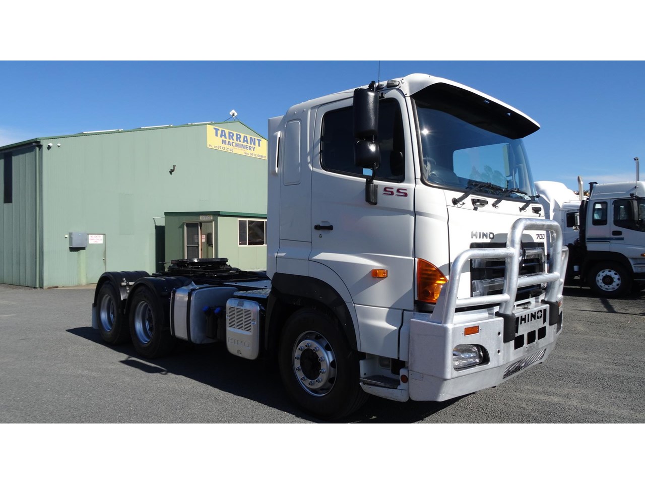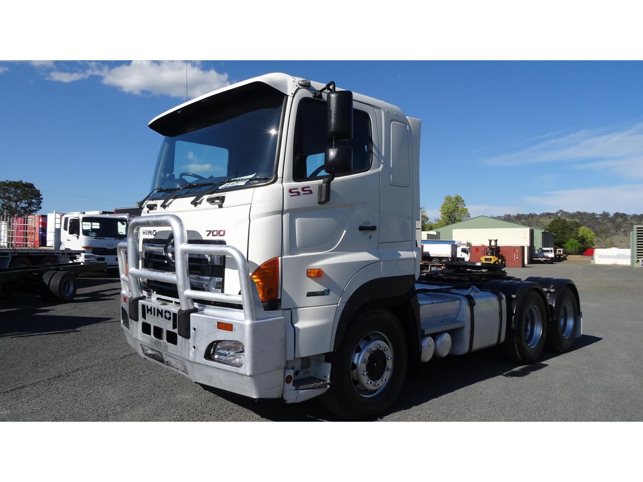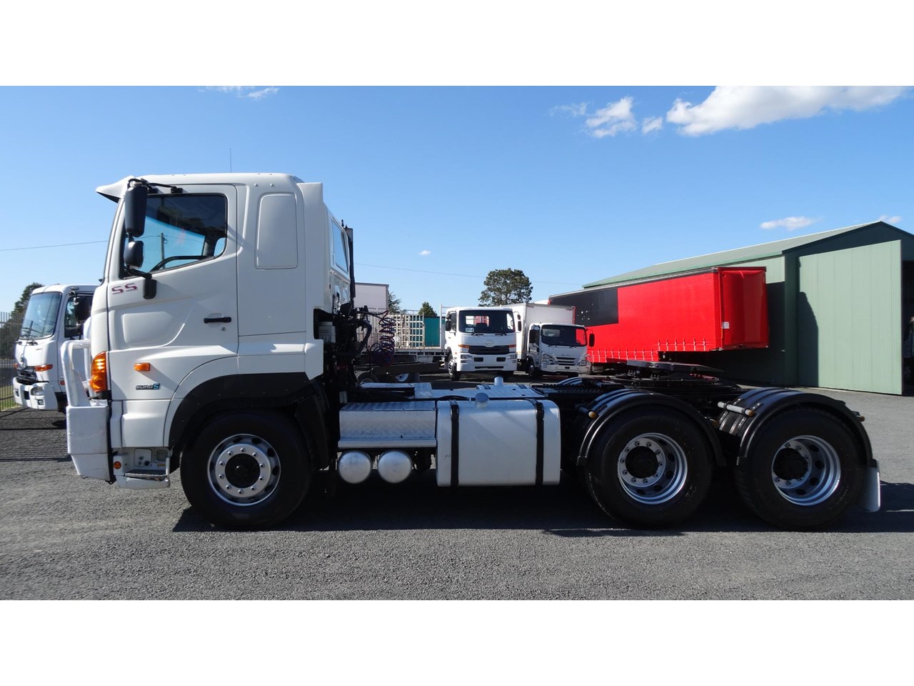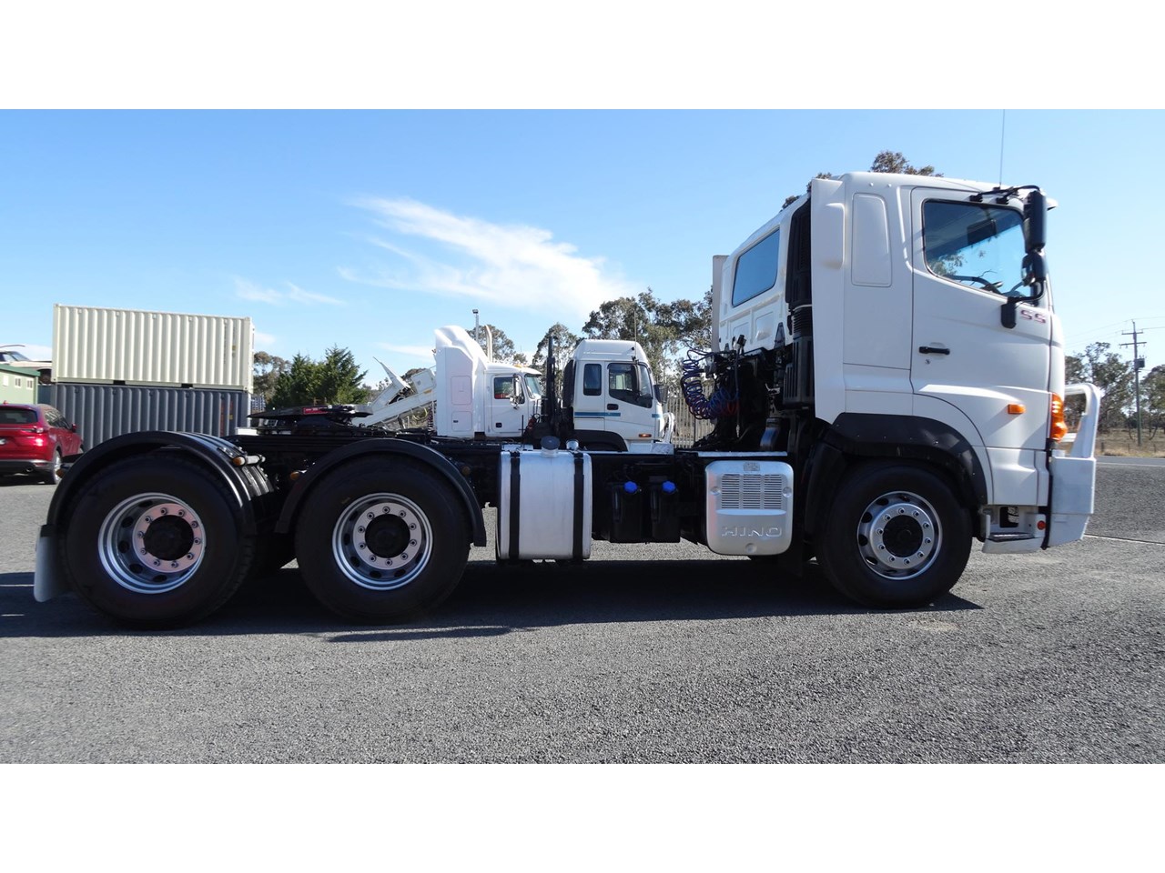 HINO 700 SS1E 6x4 PRIME MOVER, YEAR 02/2011, 539600 KMS, 480 HP TURBO INTERCOOLED, 12 SPEED AUTOMATIC ZE - AS TRONIC, 28000 GVM, 72000 GCM, 4000MM WHEELBASE, 4650MM OF CHASSIS BEHIND THE CAB, AIRBAG SUSPENSION, CROSS LOCKS, DIFF LOCKS, ALLOY BULLBAR, CRUISE CONTROL, JOST AIRLOCK SLIDING BALL RACE TURNTABLE, S/N - 2204, PRICE - $55,000.00 INC GST, LOCATED IN ARMIDALE NSW