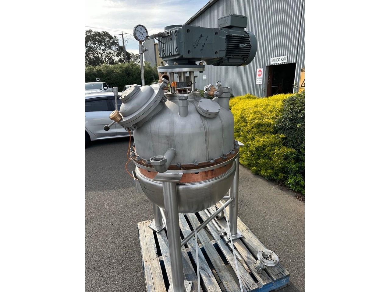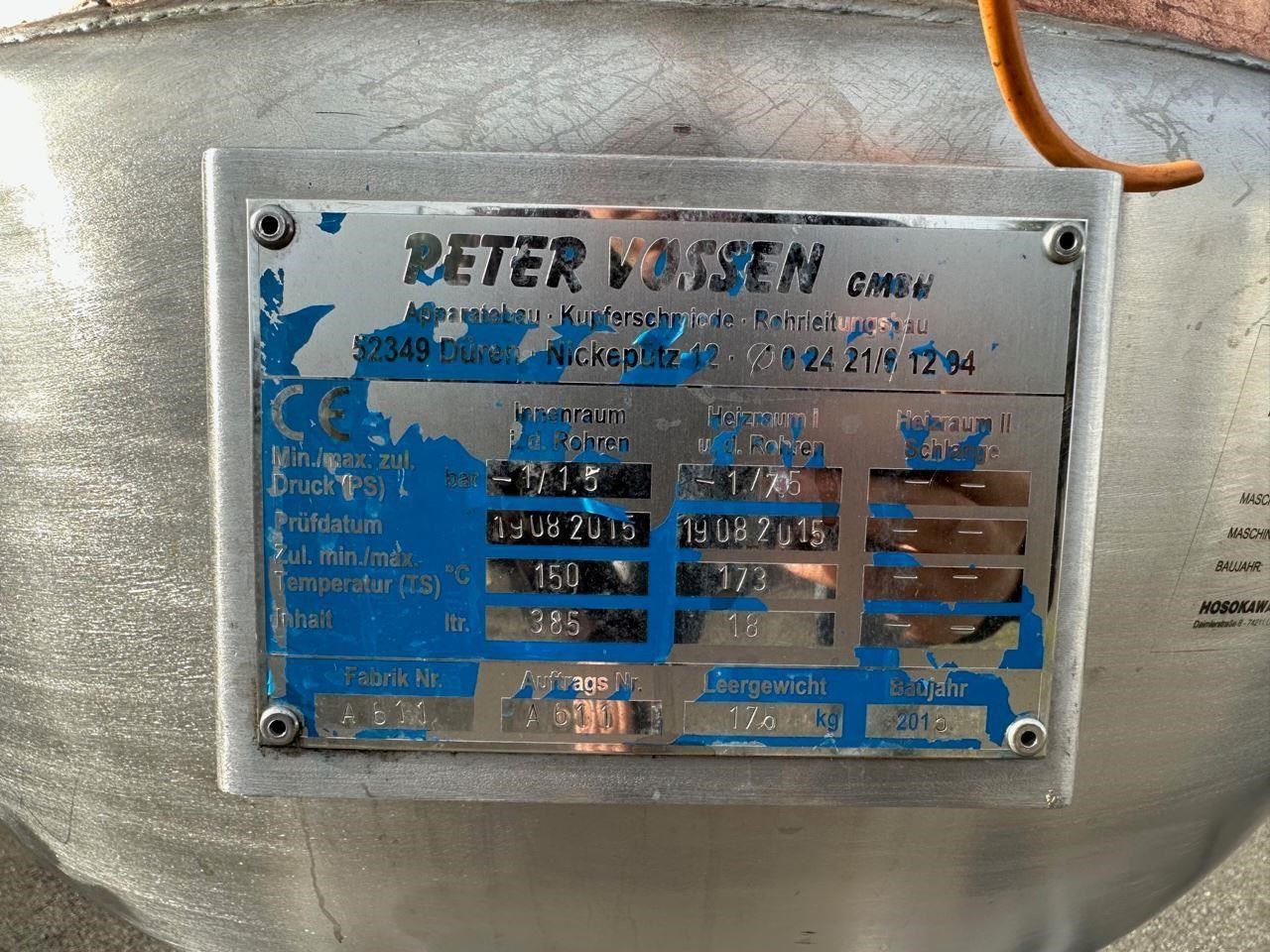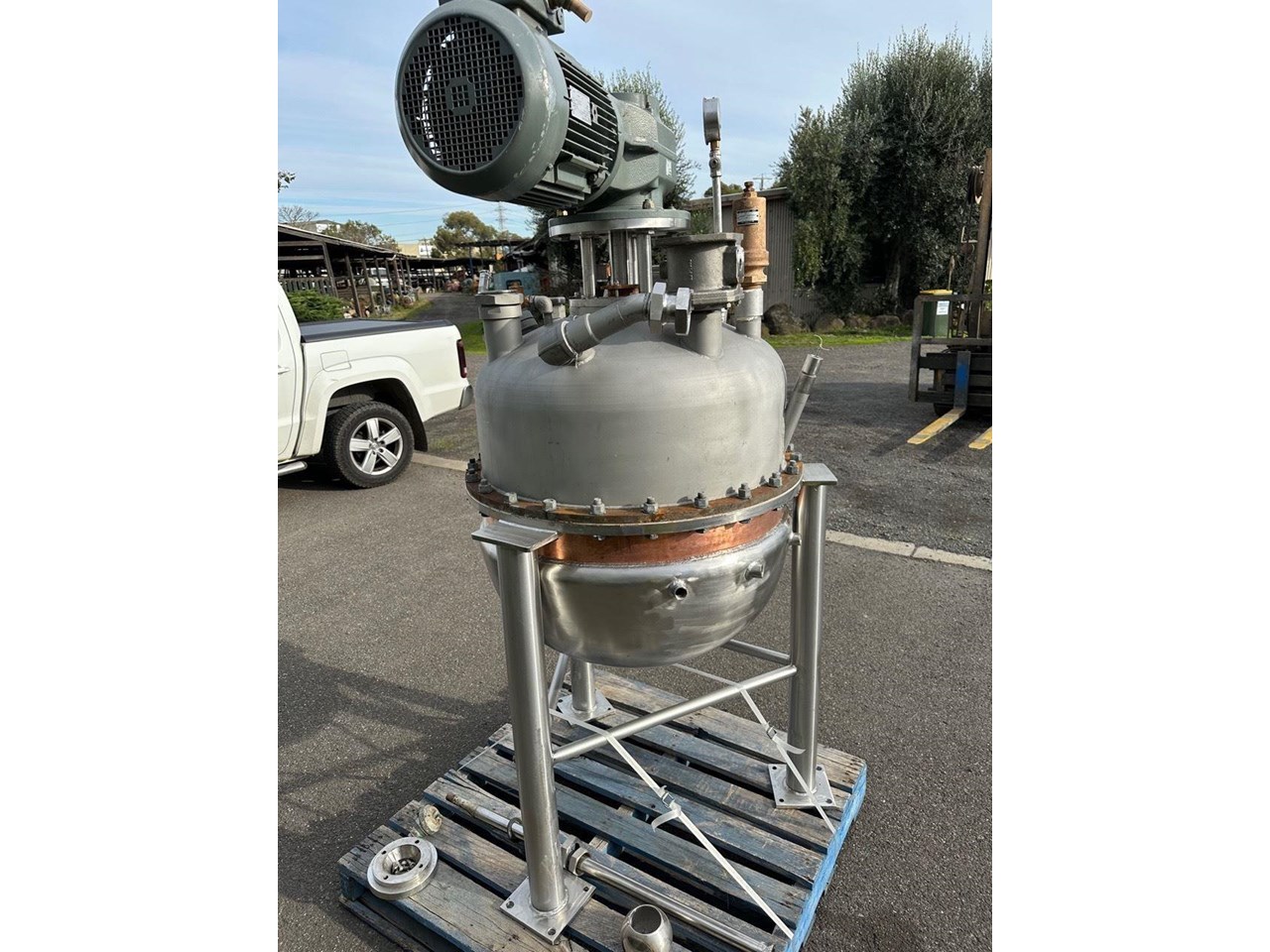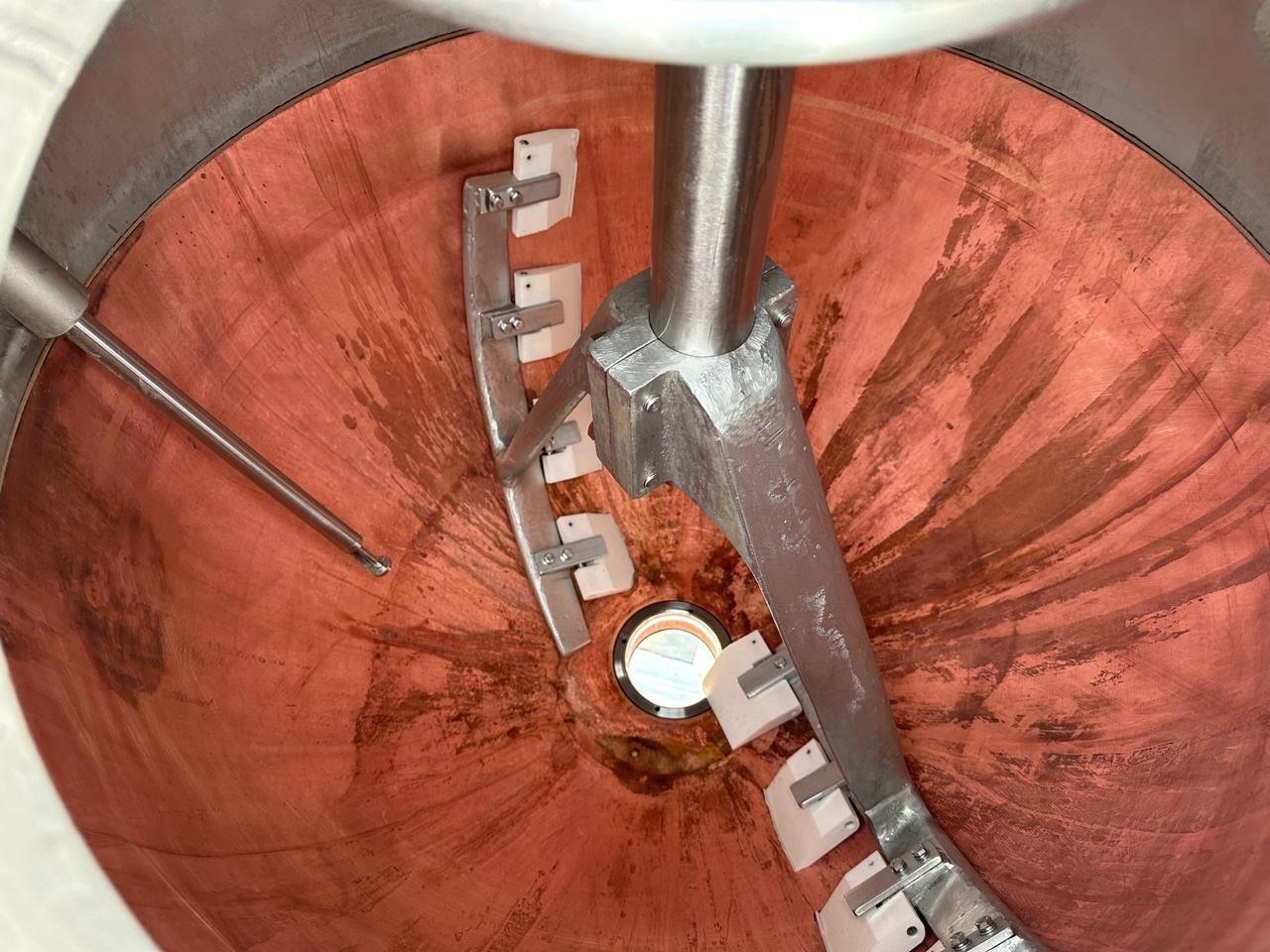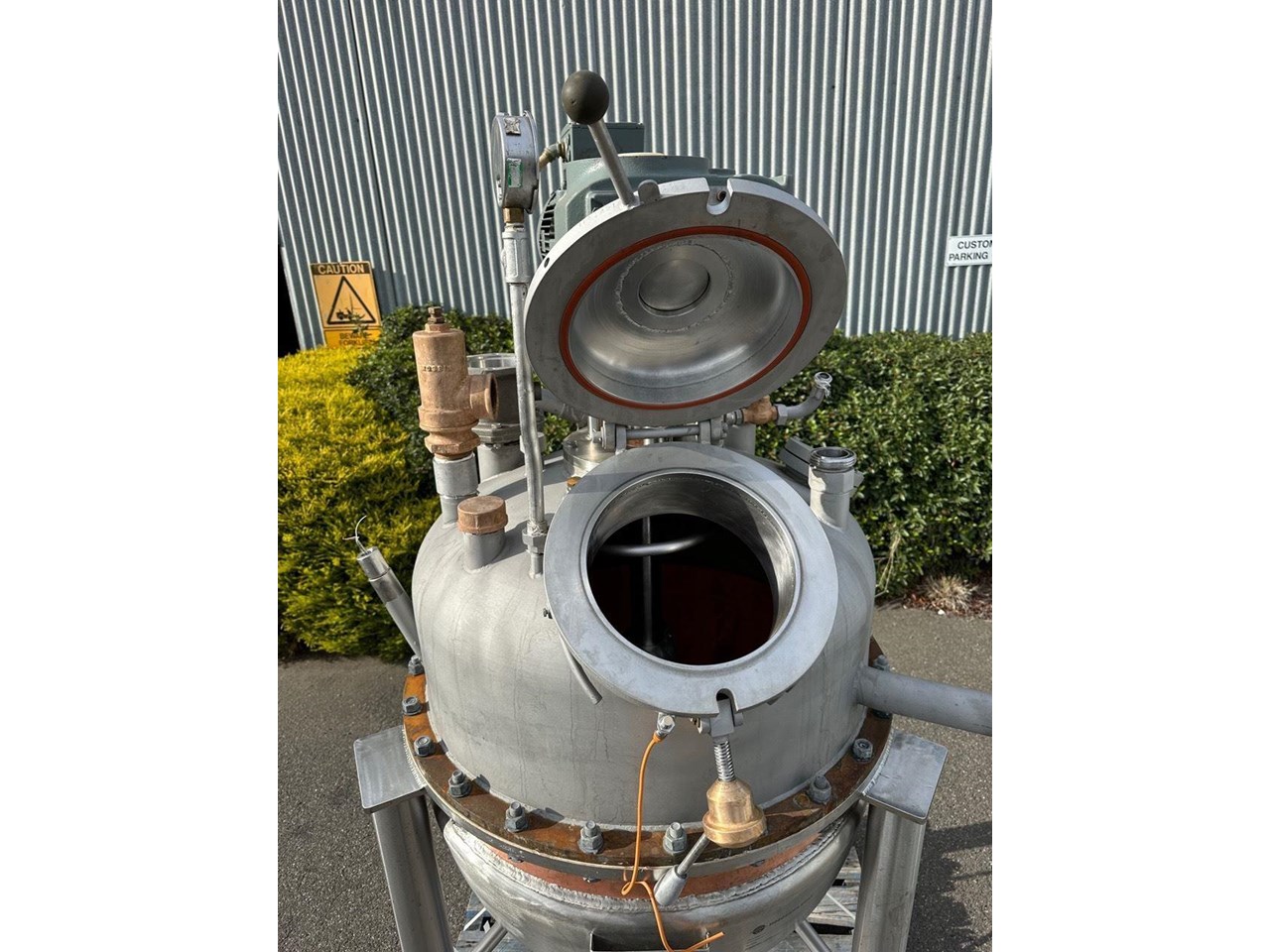 Hosokawa TBT100 Batch cooker - last used in a confectionary plant to make soft confectionary products. Specifications: Working capacity: 300kg/h Batch capacity: 80-130 kg/batch Steam working pressure: Max 10 Bar Power: 7.5kw/415V/50Hz Contact parts are Copper and Stainless steel. Multiple inlets in 2inch and 3inch and a large inspection hatch; outlet with flange YOM: 2015 Serial number: 62613-02 The TBT is a multi-task steam heated batch cooker designed for the production of soft confectionery articles such as caramel and toffee, jellies (based on pectin, gelatine, agar- agar or Gum Arabic), fruit fillings, and jams. Because of its scraped surface, even products with high protein levels can be made. The machine is designed to accommodate batches of 100 kg final product.