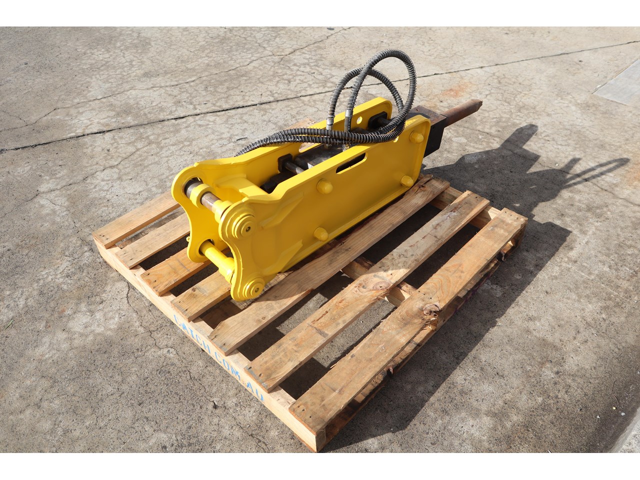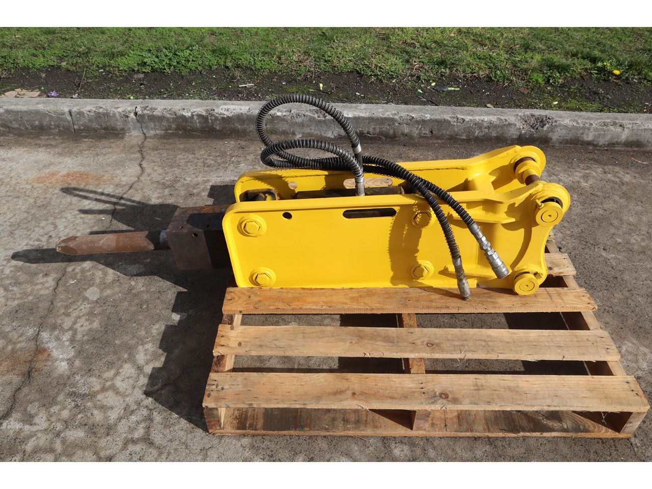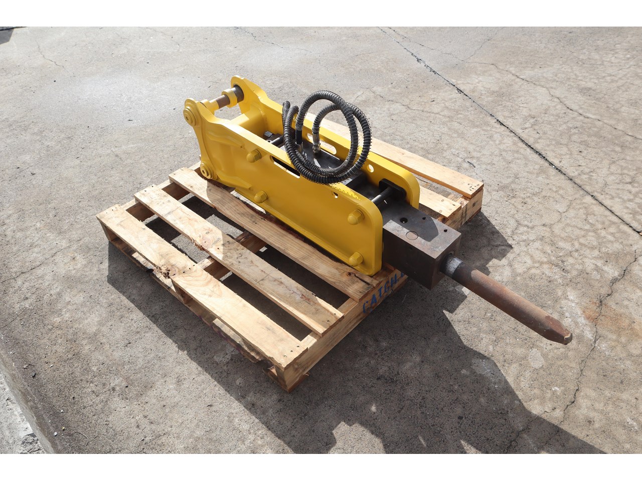 Heavy-duty hydraulic rock breaker for excavators, built with a robust side-plate body, pin-on top bracket, and two hydraulic hose connections with spring guards. Supplied with a moil (point) tool fitted, its ready to mount to a carrier with an auxiliary hammer circuit for high-impact breaking of hard materials.