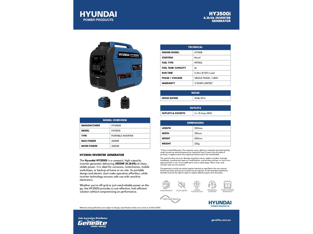 The HY3500i is a compact yet powerful portable inverter generator from Hyundai providing a convenient and cost-effective source of power, producing 3500w/4.3kVA the HY3500i is ideal for caravans and motorhomes as it allows you to take the modern luxuries from home with you wherever you go.