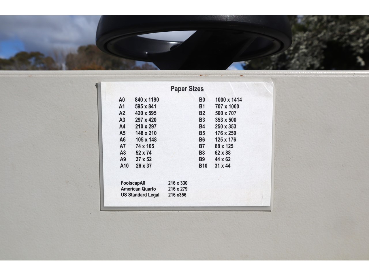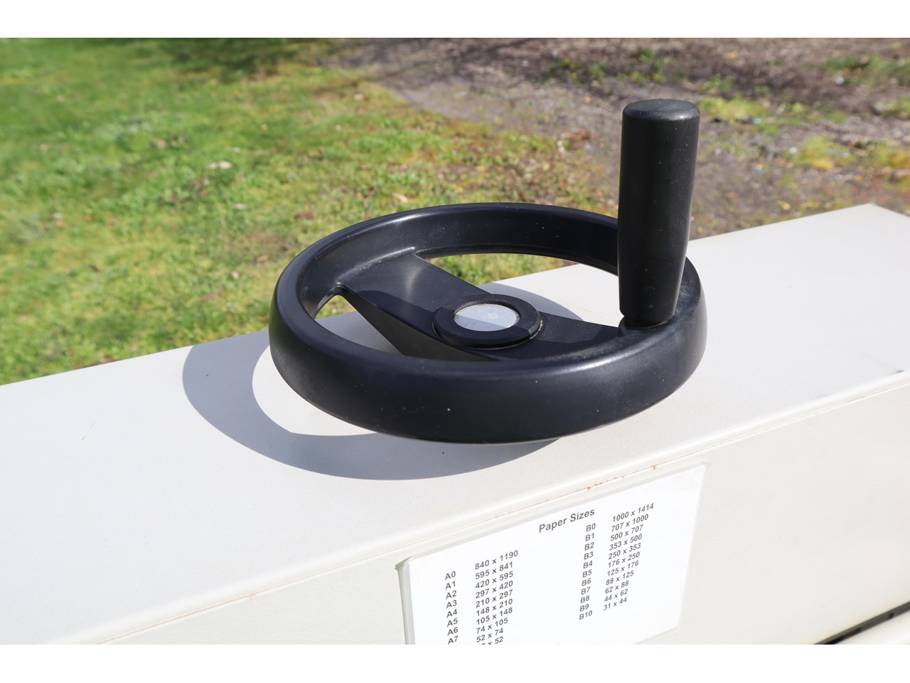 This IDEAL 4810-95 is a professional power guillotine designed for accuracy, durability, and operator safety. With a 475 mm cutting length, it handles large stacks of paper effortlessly. A manual spindle clamping system with large handwheel ensures firm, even pressure, while the spindle-guided back gauge with hand crank and analogue readout provide precise positioning in millimetres or inches.