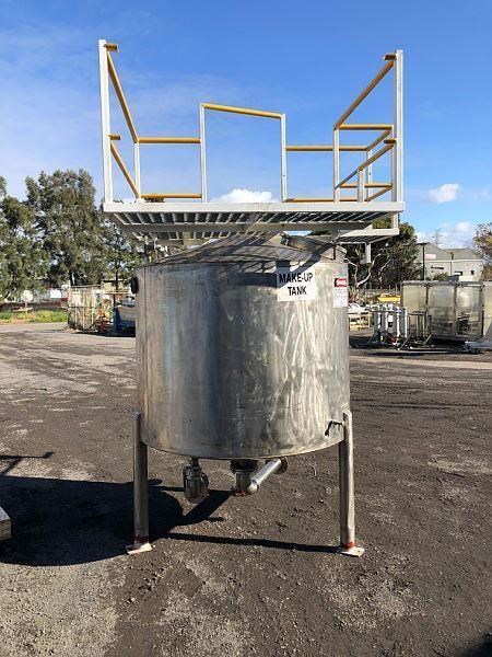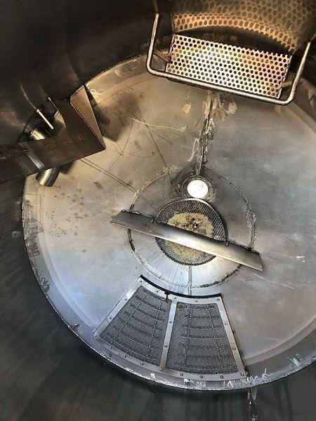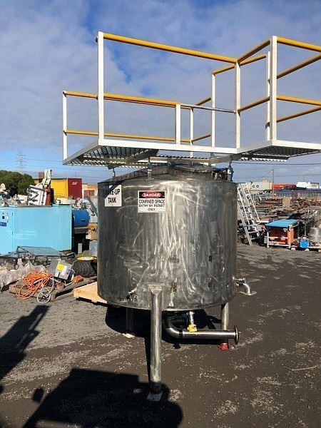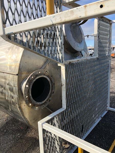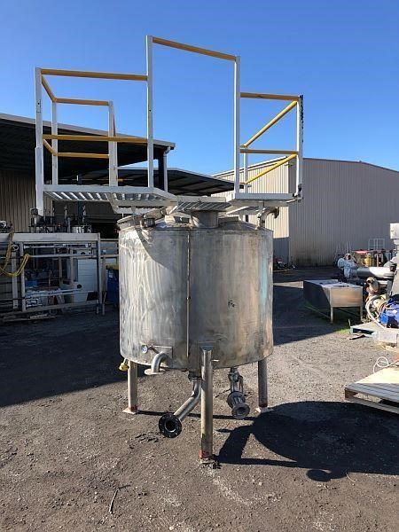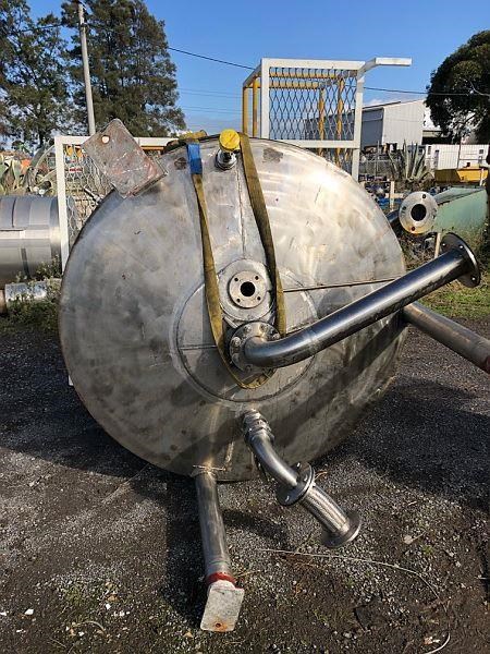 2500L Process vessel. (last held liquid sugar) Stainless steel 316. 1600 Diam. Cone bottom 100mm outlet with secondary outlet and valve. Screens over the outlets. Manhole cover. Overall height vessel 2340mm 1200 safety rail. Temp gauge.