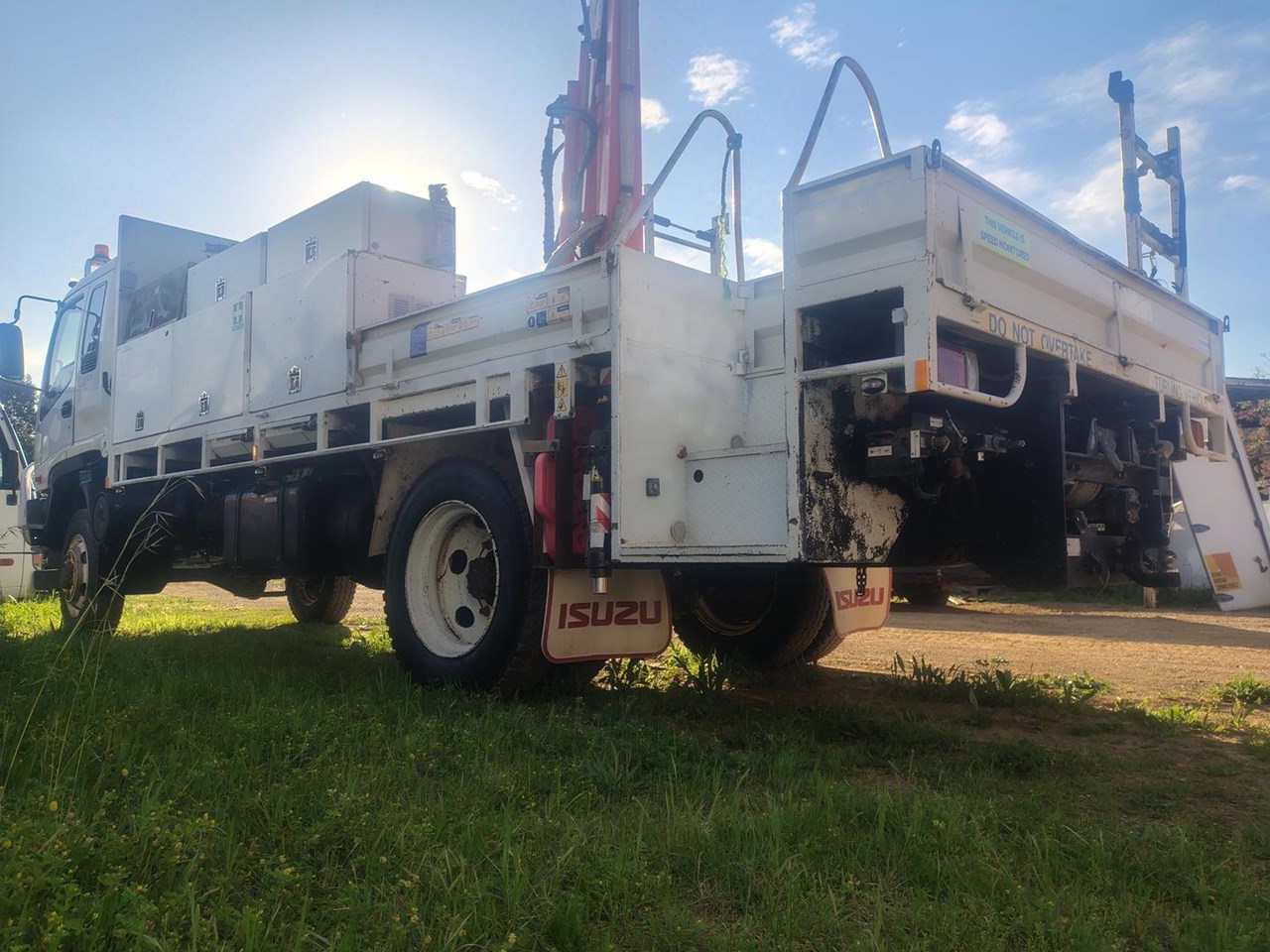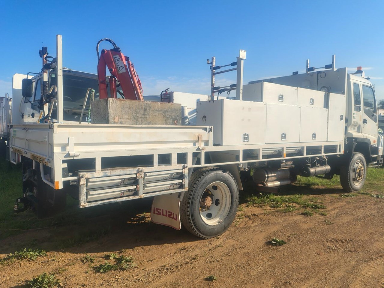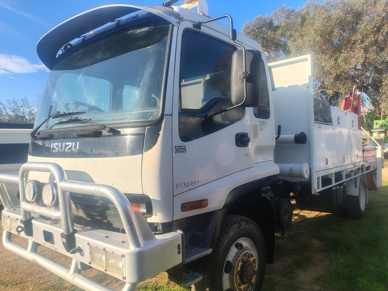 2005 Isuzu FSS550 4x4 Tray / Service Truck, ex government, tool boxes, Palfinger PC330 crane, runs and drives very well. Tool boxes and crane can be removed to make steel top tray if required