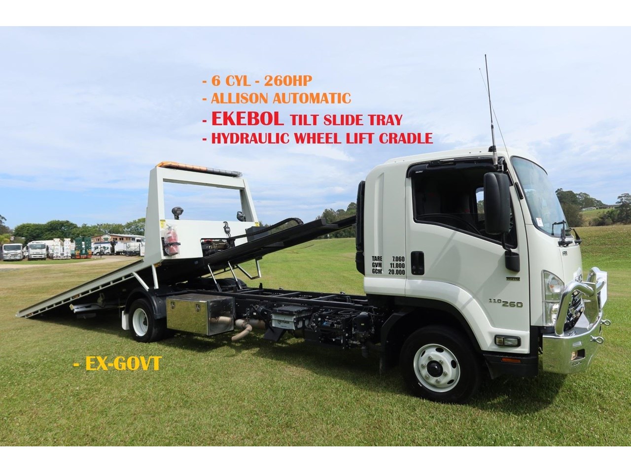 1 x only used 11 / 2021 Isuzu FRR 110-260 Auto 7.8 litre, turbo / intercooled, 260hp, 6 speed ALLISON AUTOMATIC inc air conditioning, an Isuzu Alloy bullbar, L.E.D spot lights, Isuzu canvas seat covers, a GME UHF radio and Isuzu rubber floor mats.
