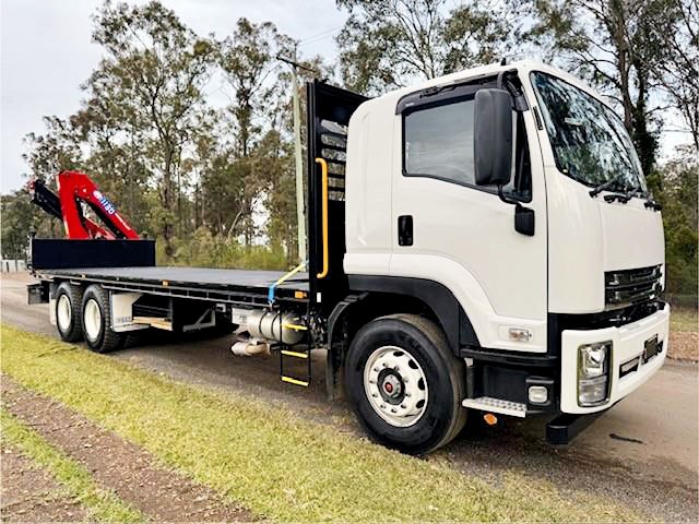 08/2024 Isuzu FVY 240-300 auto LWB with diff-lock, new 8m West-Trans-HMF tray and crane package, HMF 1130-K3 remote controlled crane rated at 9.9TM, tray is fitted with slide-on ratchet strap winches and toolbox, full setup is basically brand new with only 1750kms, warranty till mid-2031, registered until May 2026, comes with 2T rated self levelling pallet hook, selling for $355,000+GST