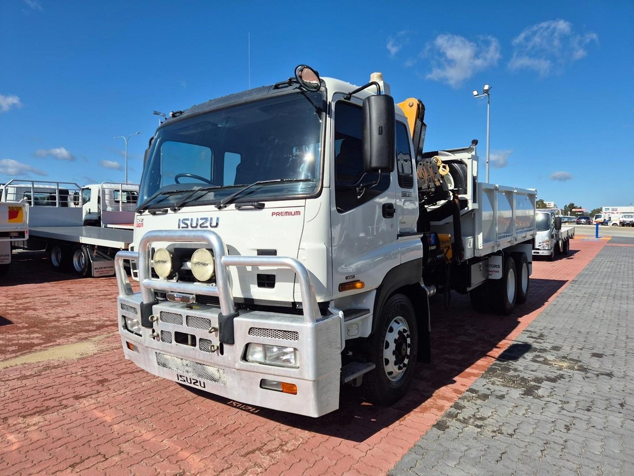 Ex Government Low Low Klm ISUZU GIGA CXZ415 AUTO Tipper and Crane Combo, 415HP Powerplant coupled to a 12 Speed Automated Transmission, fitted with 4.5m Drop Side Tipper Body with a Bartlett Ball Towbar, with Air to Rear, Reverse Camera. Bullbar, UHF Radio, Underbody Toll Boxes, Amber Beacons and complete with a Remote Controlled EFFER 100/4S Crane and will impress!