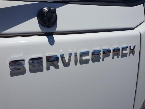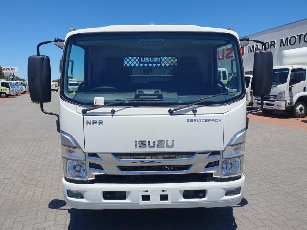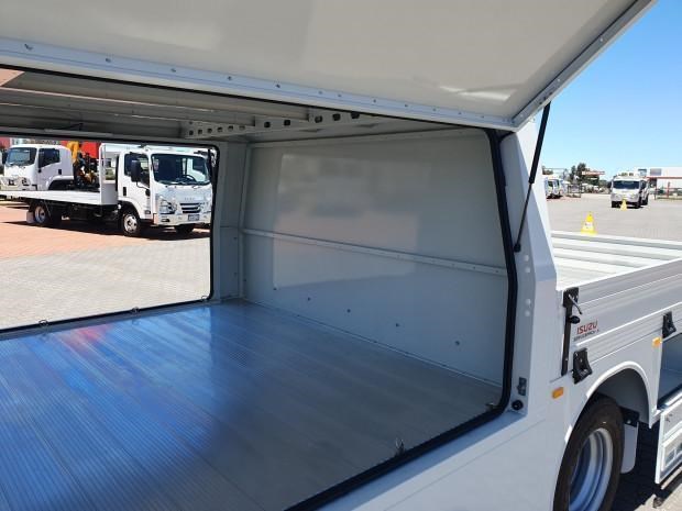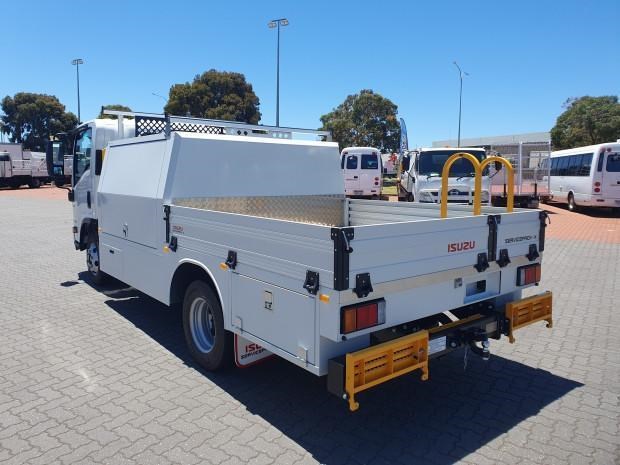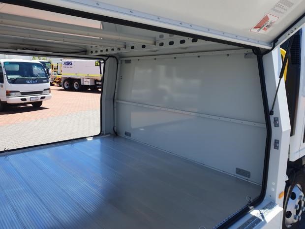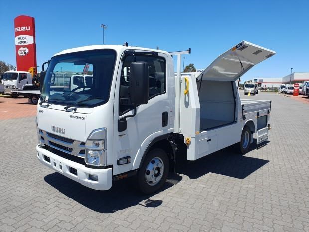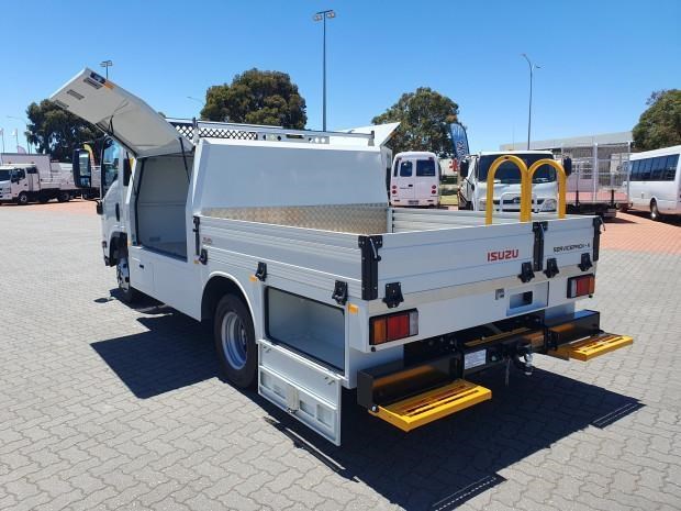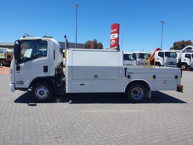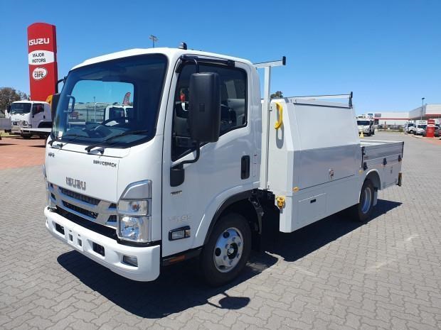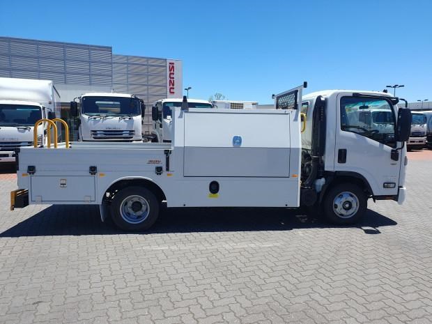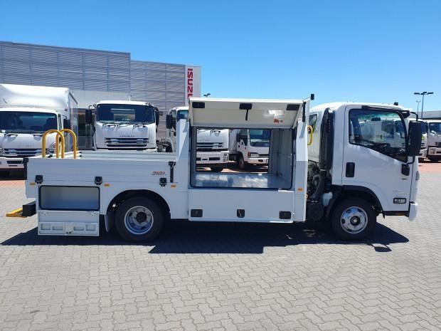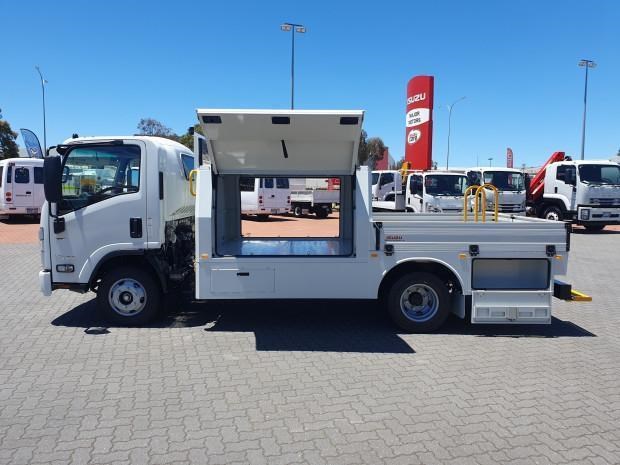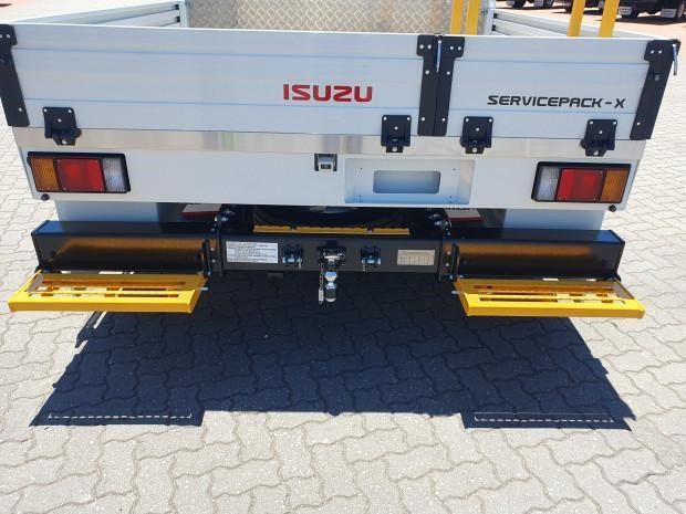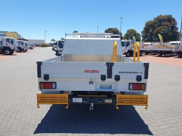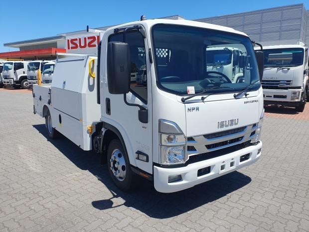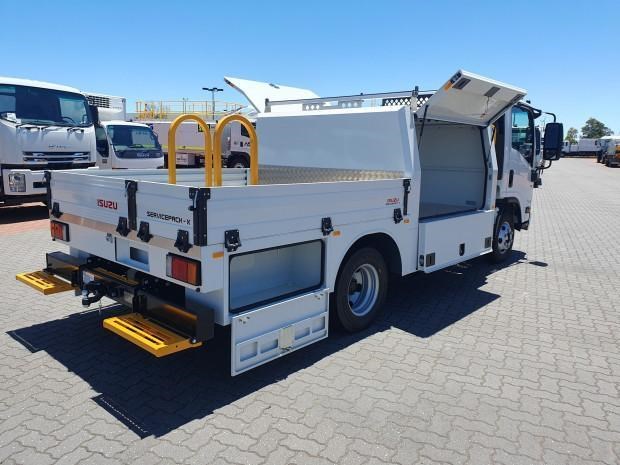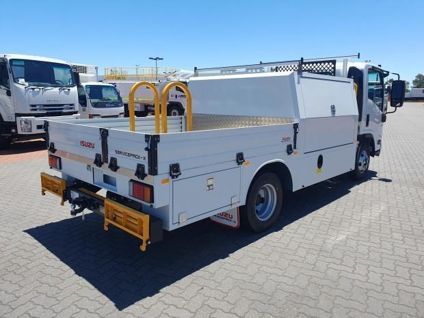 New MY21 Isuzu NPR45/55-155 AMT 4x2 Servicepack - X, complete with a Fully powder-coated lightweight hybrid aluminum and steel service body / Large open access main storage compartment and underbody boxes / Gullwing doors for maximum versatility and accessibility / Compact rear tray with checker plate floor, drop down sides and integrated load restraint anchor points / Body mounted roof racks / LED interior lighting / Front and rear yellow non-slip steps and grab