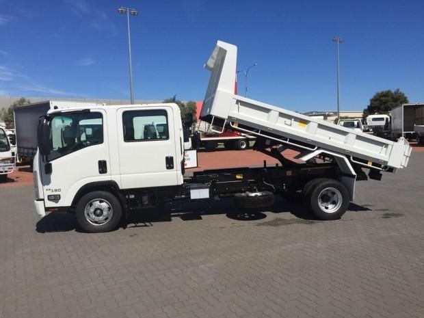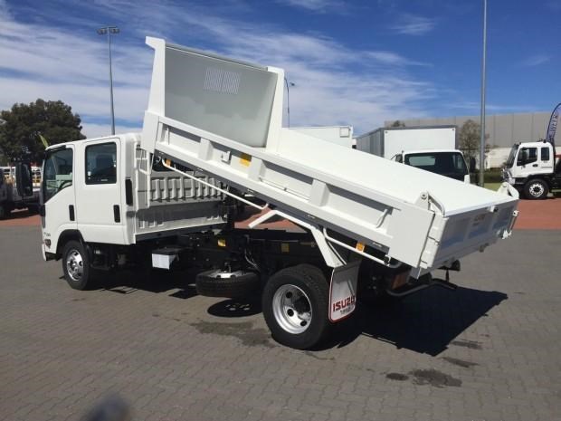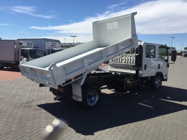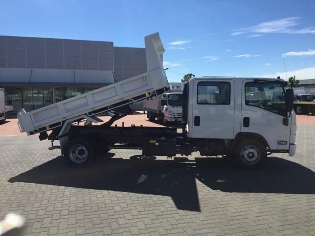 New Model MY21 2025 Compliance Isuzu NPR65-190 3 Ton Crew Tippers with seven-seat Isuzu crew cabs with factory fitted with a 3.6m dropside tipper body, 2-way tailgate, featuring the big 5.2ltr turbo diesel Isuzu engine producing a massive 190hp coupled to a 6 Speed Manual Transmission.