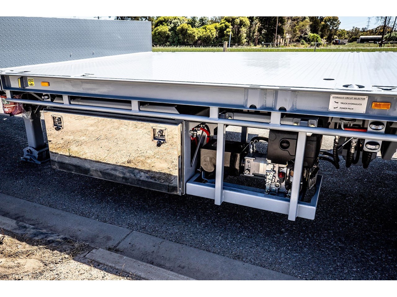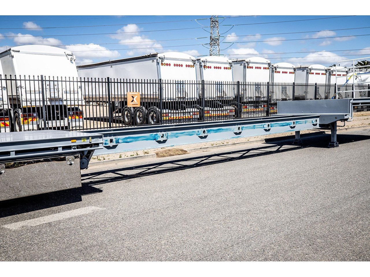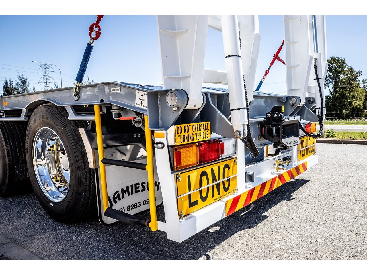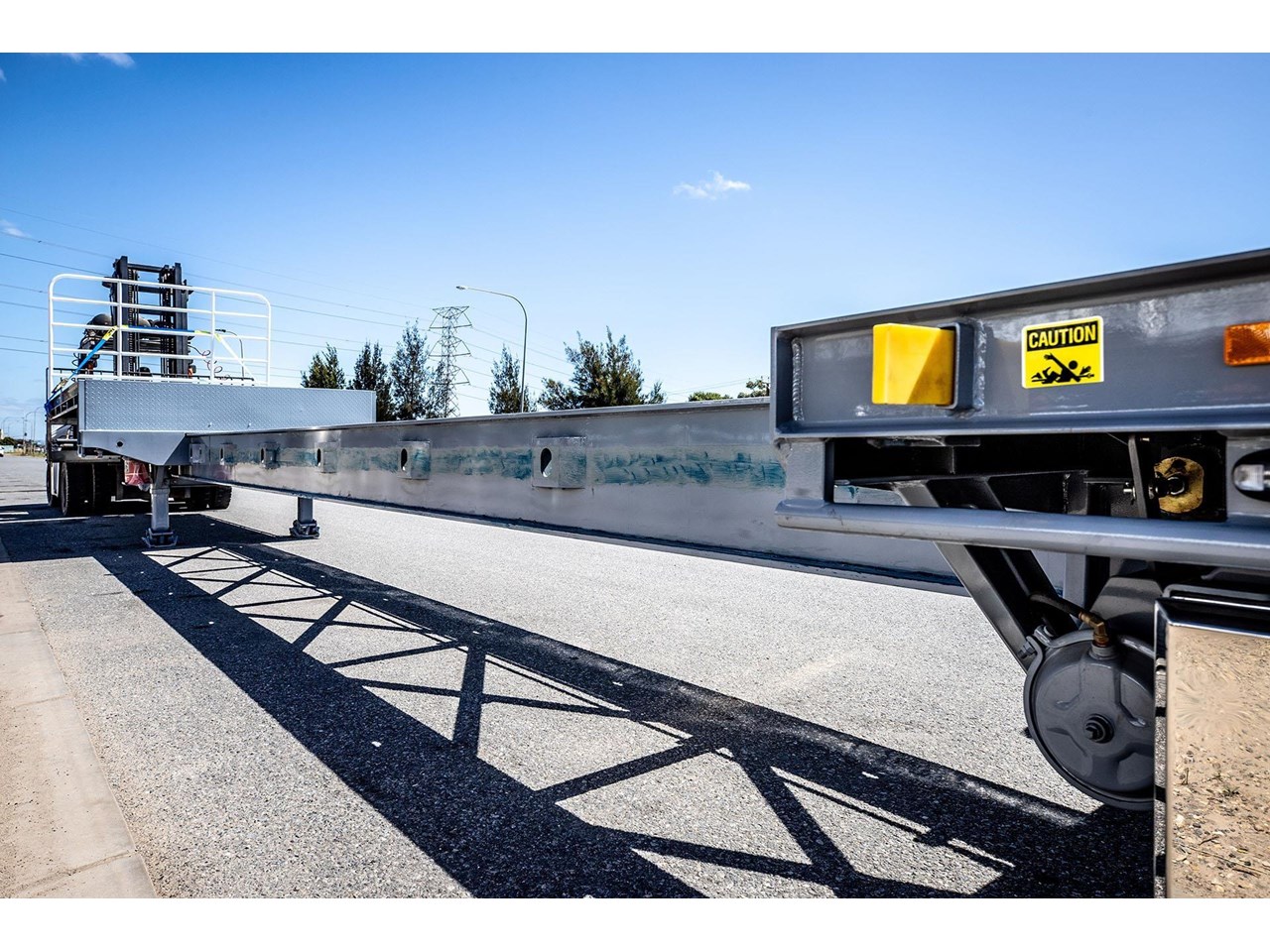 Extendable length and various container pin positions provide flexibility for different load sizes, while the drop deck design allows for taller loads to be carried legally by creating a lowered central deck. Extension is achieved via a connected prime mover and installed slider mechanism with air-operated lock pins.