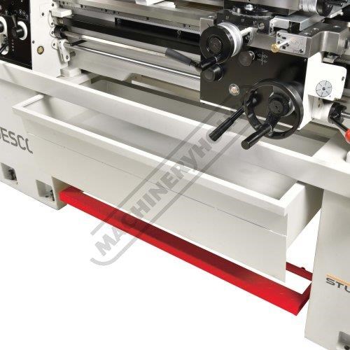 The Variable Speed Studturn boasts an impressive spindle speed of 2500rpm and features a fully enclosed universal gearbox, offering a comprehensive range of threading and feeding options. Designed with safety in mind, it includes leadscrew covers, chuck and chip guards, an additional emergency stop switch, and a convenient footbrake for enhanced operator protection.