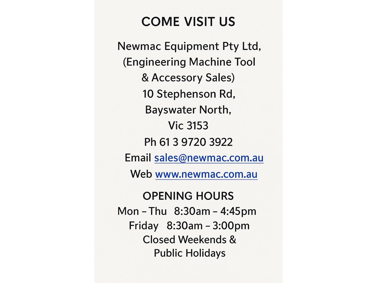Customers are welcome to inspect the machine at our Bayswater North warehouse. Where possible, we are happy to demonstrate the machine under power to give confidence prior to purchase.