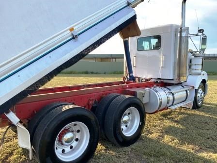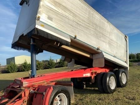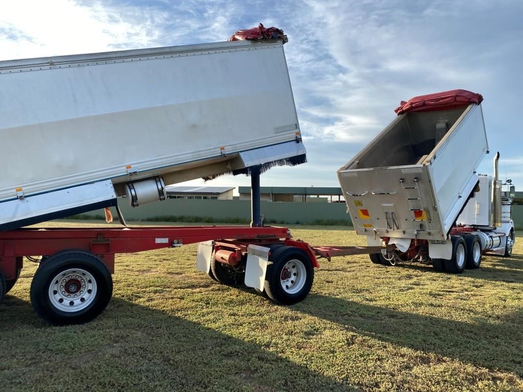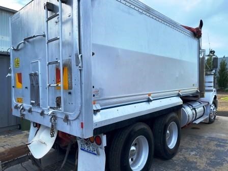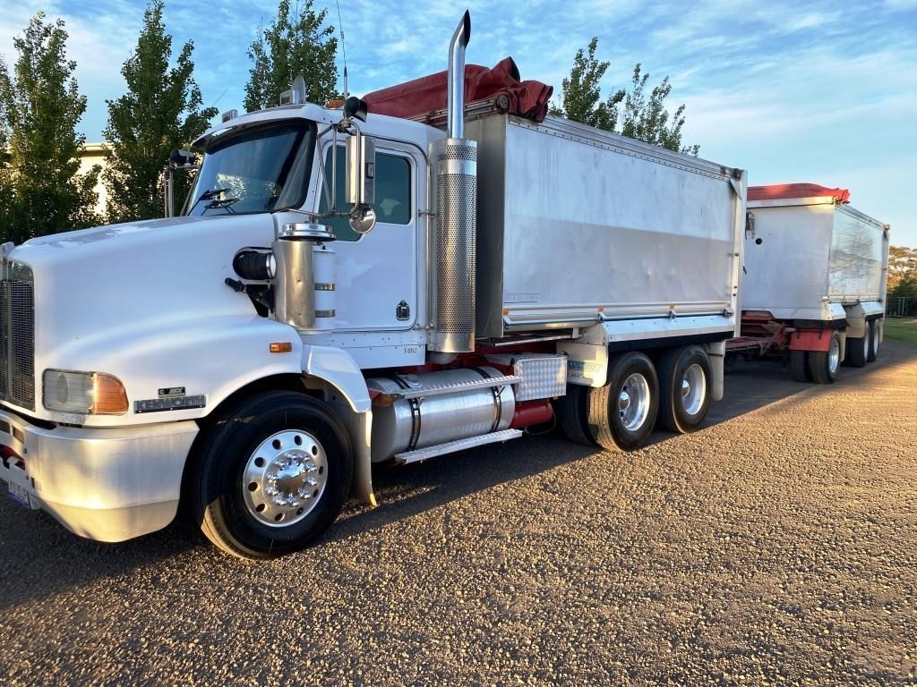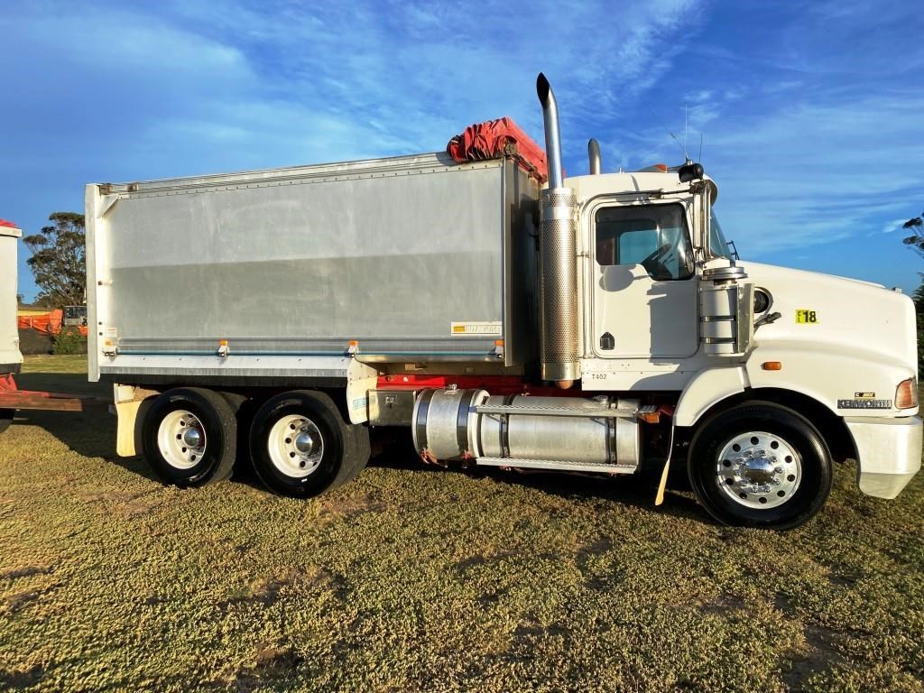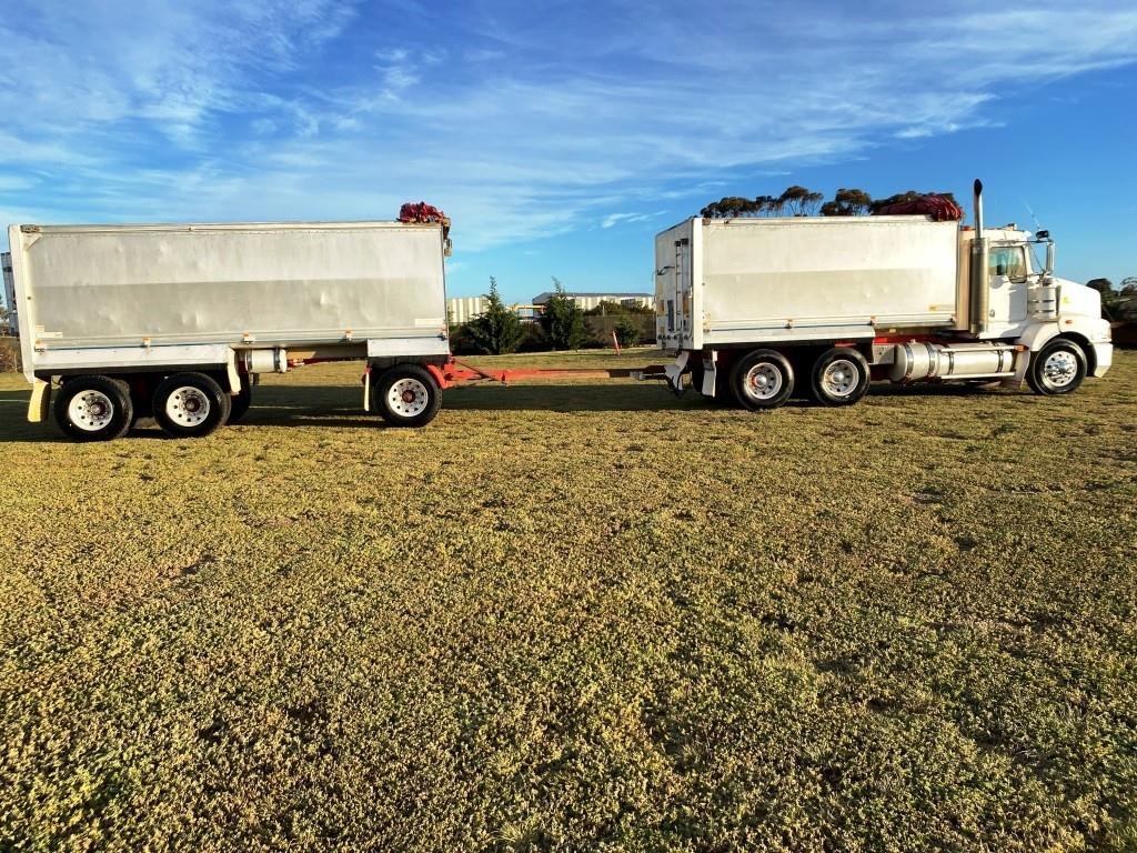 Kenworth T402 truck and dog combination- 04/2010, fitted with ISX 475 Cummins, Cobrashift auto, Rockwell diffs with full cross locks and power divider lock on 8 bag air suspension, runs and drives really well, cold air cond, and is quite straight and tidy. Fitted with Sloanbuilt alloy bin, and electric tarp, hoist and subframe are good, the bin floor is not flash, and really needs re lining, but will still do a job.