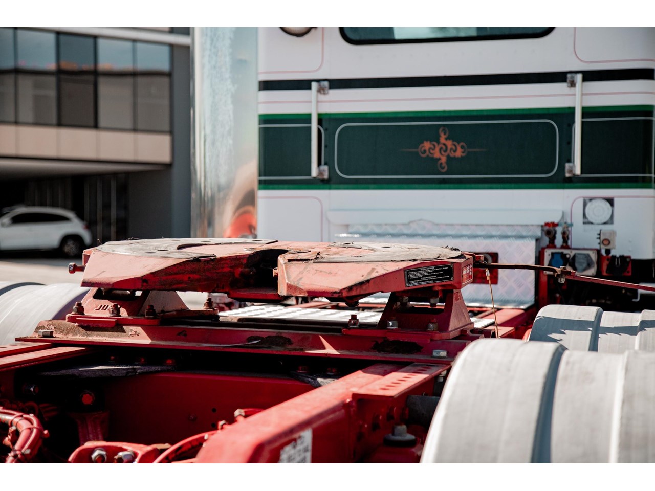 Cummins ISX E5, 18 Speed R/R, DANA Spicer RSH40 @ 4.11, AG suspension, GCM: 50,000, Hydraulics, JOST Fixed turntable.