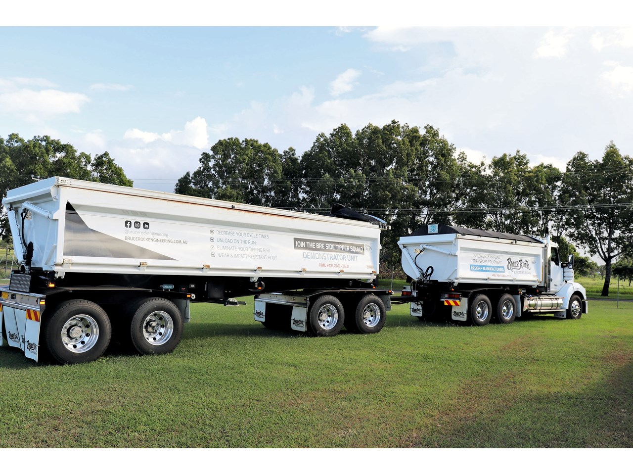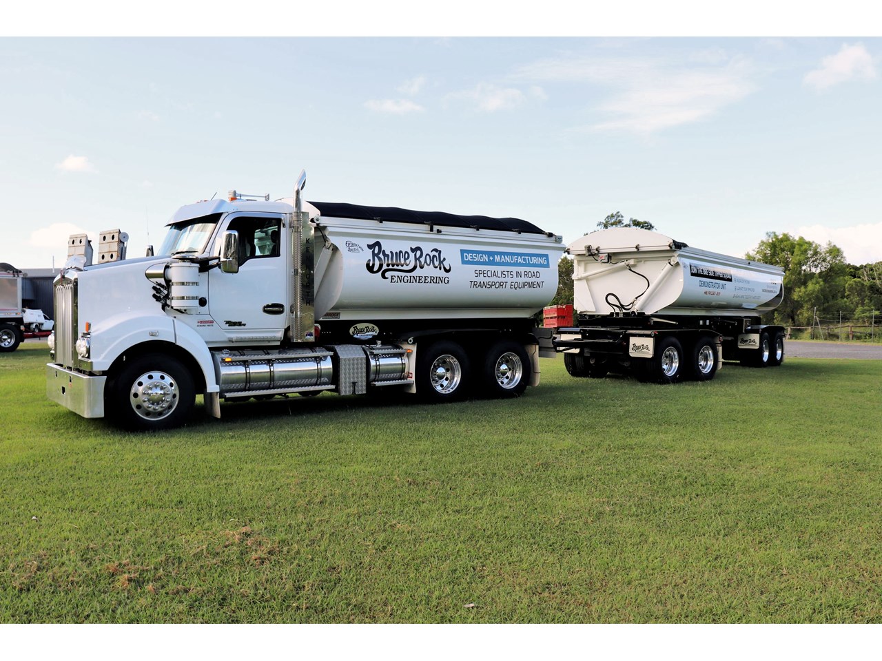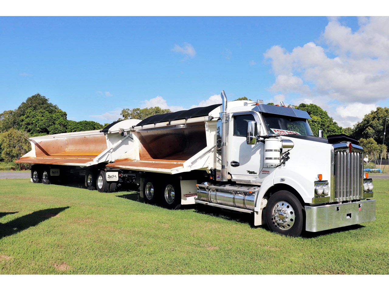 Worth the enquire on new direction in quarry product safety delivery, app 38,000 kilometres, Cummins X15, 18 sp trans, 46 rear axles on KW airbag, Ex Demonstrator Bruce Rock Engineering rigid side tipper body & coupled to 4 axle Bruce Rock Engineering side tipping dog trailer, Hendrickson Intraax air bag suspension, electric tarps, Truck & Trailer: Payload 38.0T/ HML 58.0T tare 19.90T, PBS rated unit.