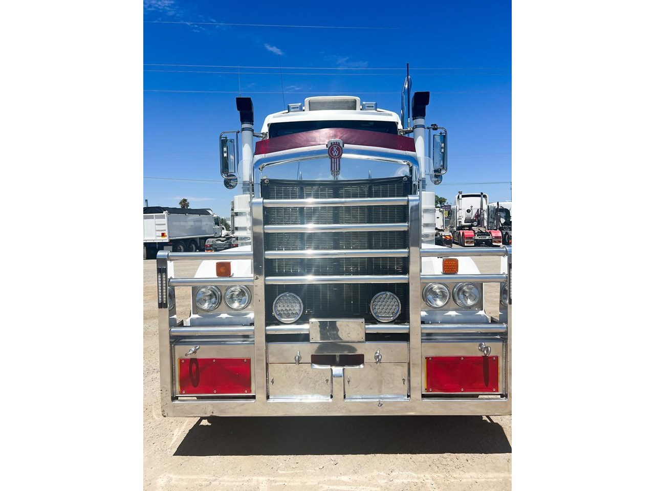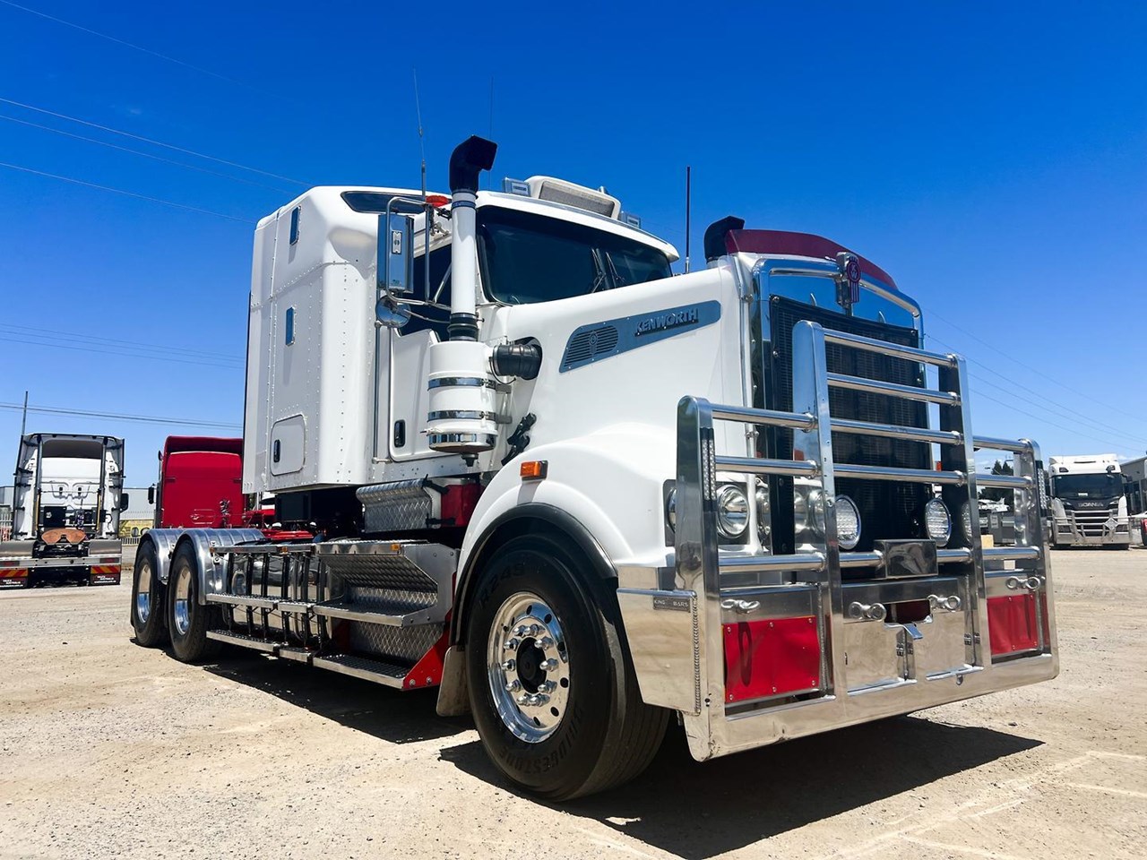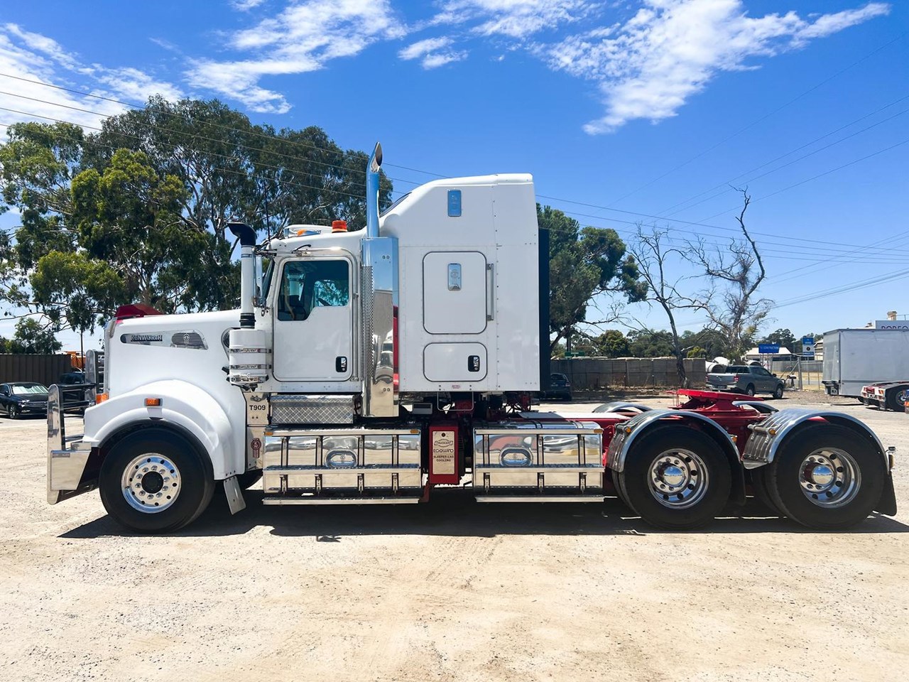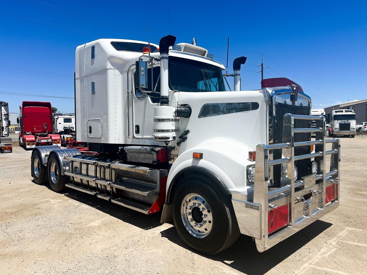 2017 Kenworth T909 6x4 prime mover,600 hp Cummins X15 eng-Has had Cummins mid life done- with 18 spd trans-RTL020918B,Meritor RT52-190 Rear axles @ 4.56 on Neway AD246/10 air bag susp,Alloy wheels and FUPS bull bar,Super singles on steer,50" high roof intergreated sleeper with Ecowind bunk air con,Diff and rear axle x lock,Roof mounted air con condensor,2 x rotating beacons,Dolly pull in rear with air and electric fittings,Draw Fridge,Rad/Cd,UHF,Water tank,3.5" Fixed is a very tidy low km 140 ton rated truck.