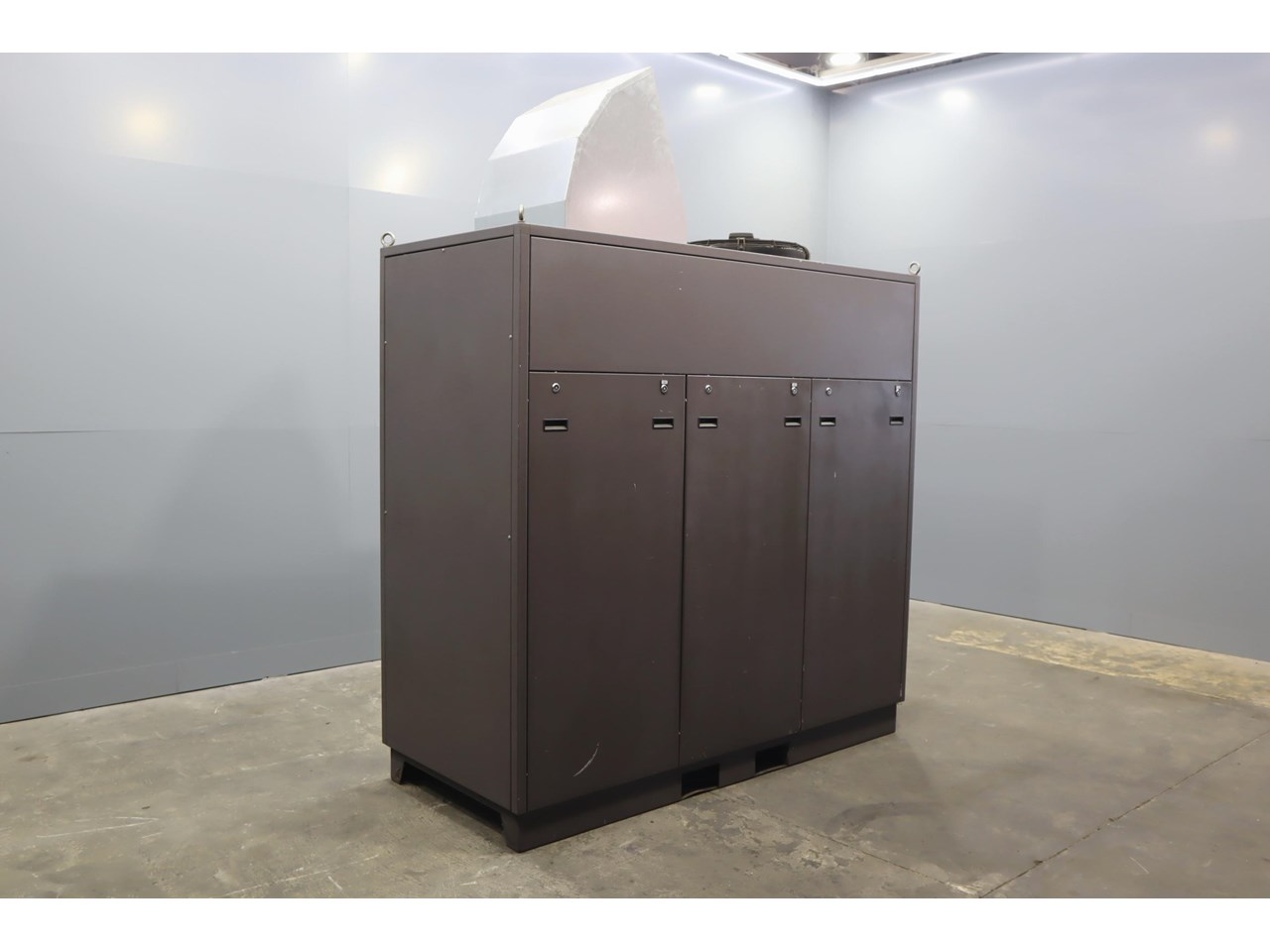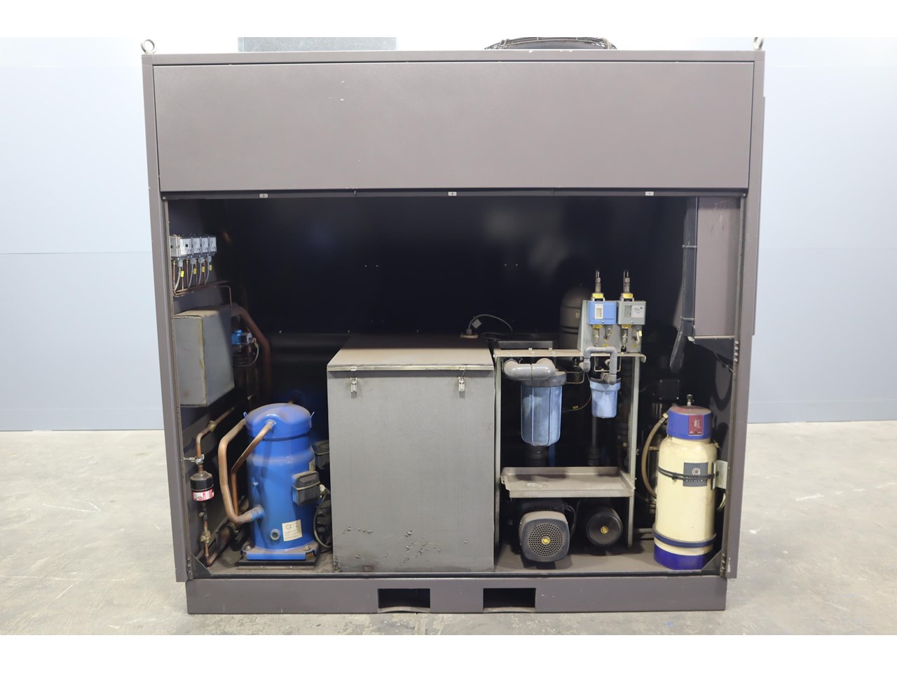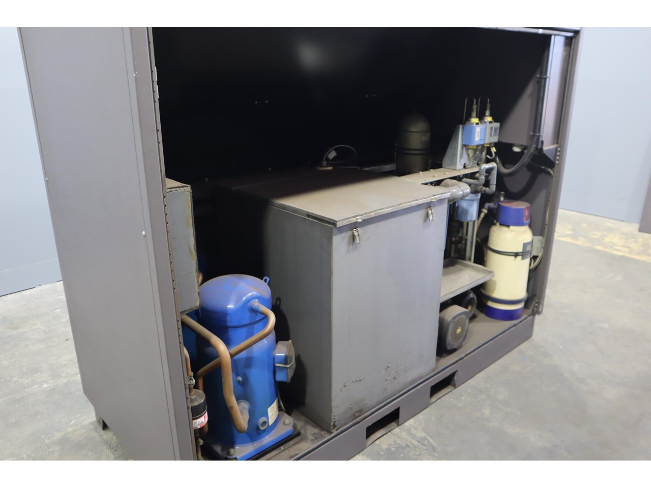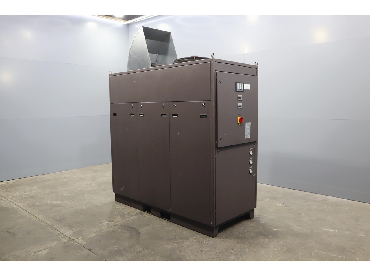 Industrial water chiller in excellent condition. This unit is housed in a fully enclosed cabinet, fitted with a roof mounted condenser fan and ducting. The control panel includes digital temperature and pressure monitoring with safety interlocks, making the system straightforward to operate and integrate into existing plant equipment.