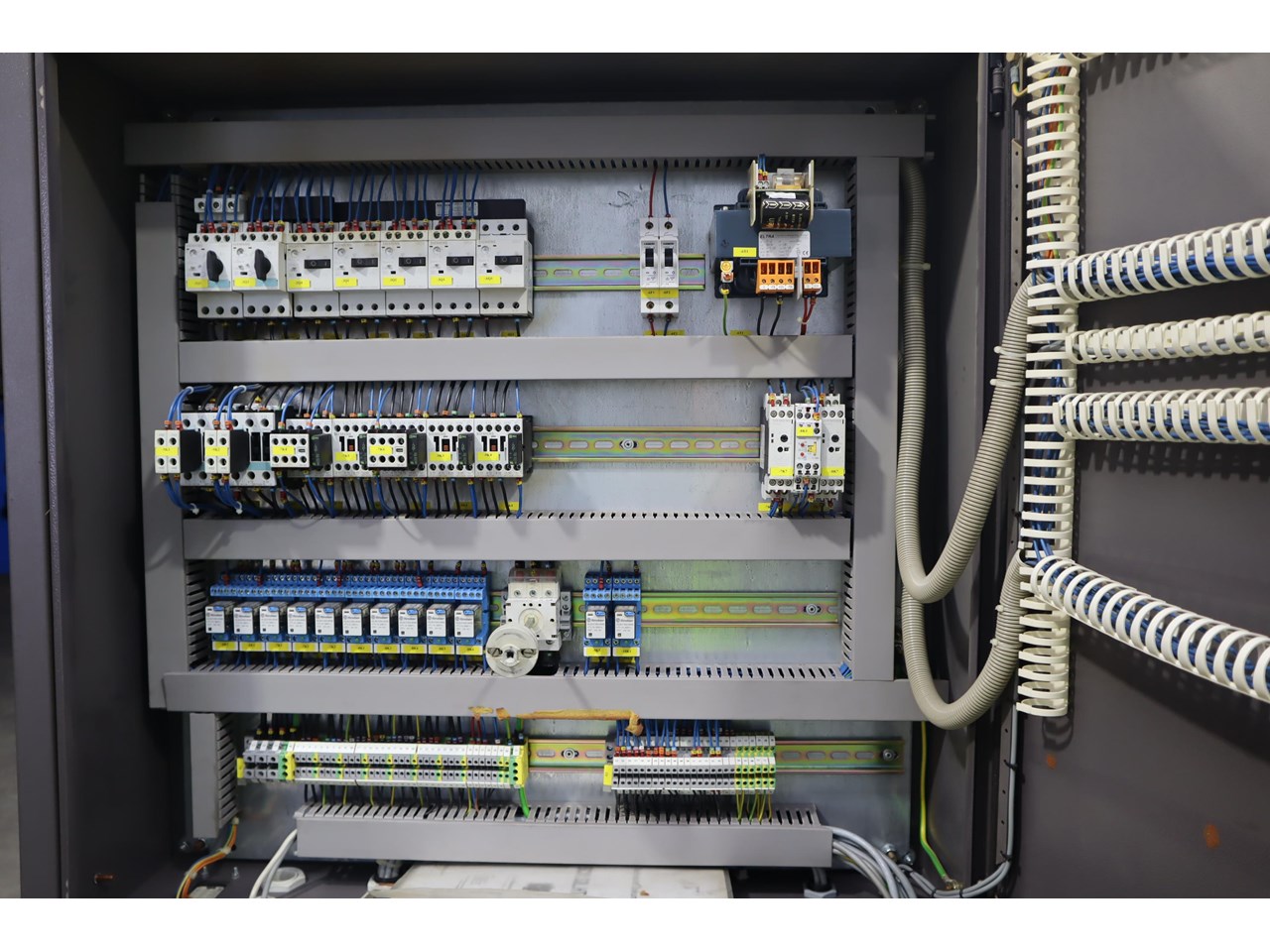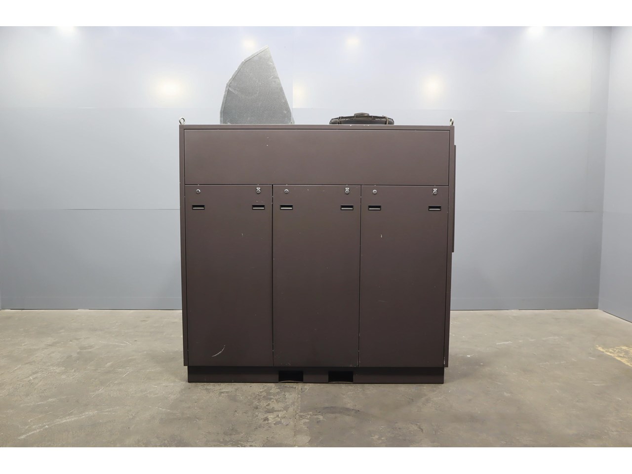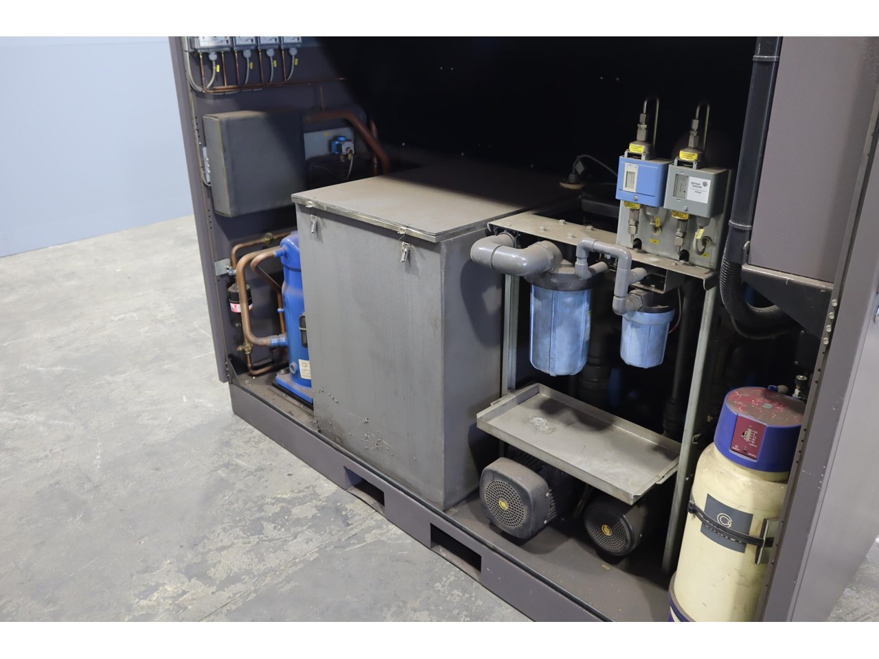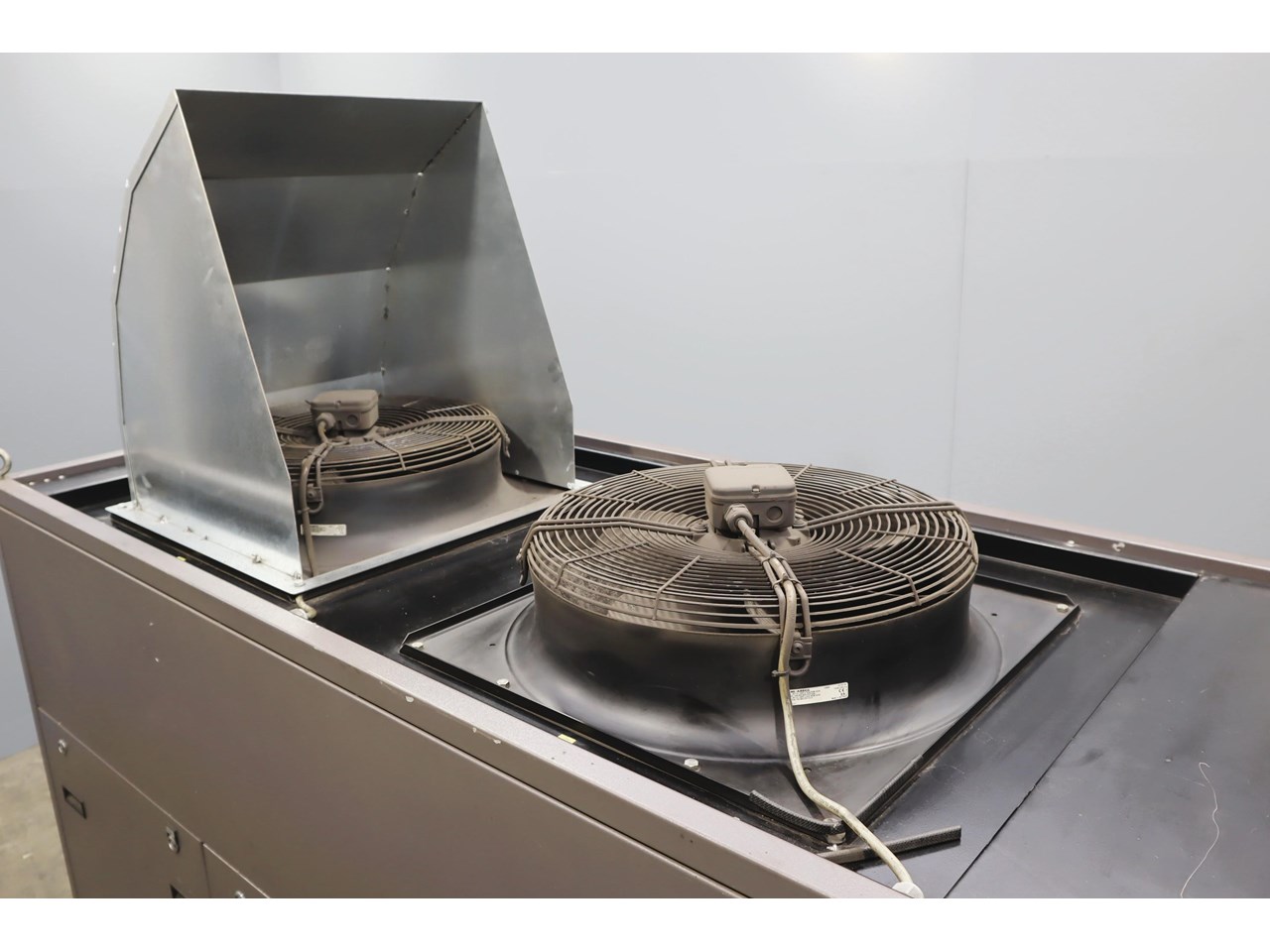 Industrial water chiller in excellent condition. This unit is housed in a fully enclosed cabinet, fitted with a roof mounted condenser fan and ducting. The control panel includes digital temperature and pressure monitoring with safety interlocks, making the system straightforward to operate and integrate into existing plant equipment.